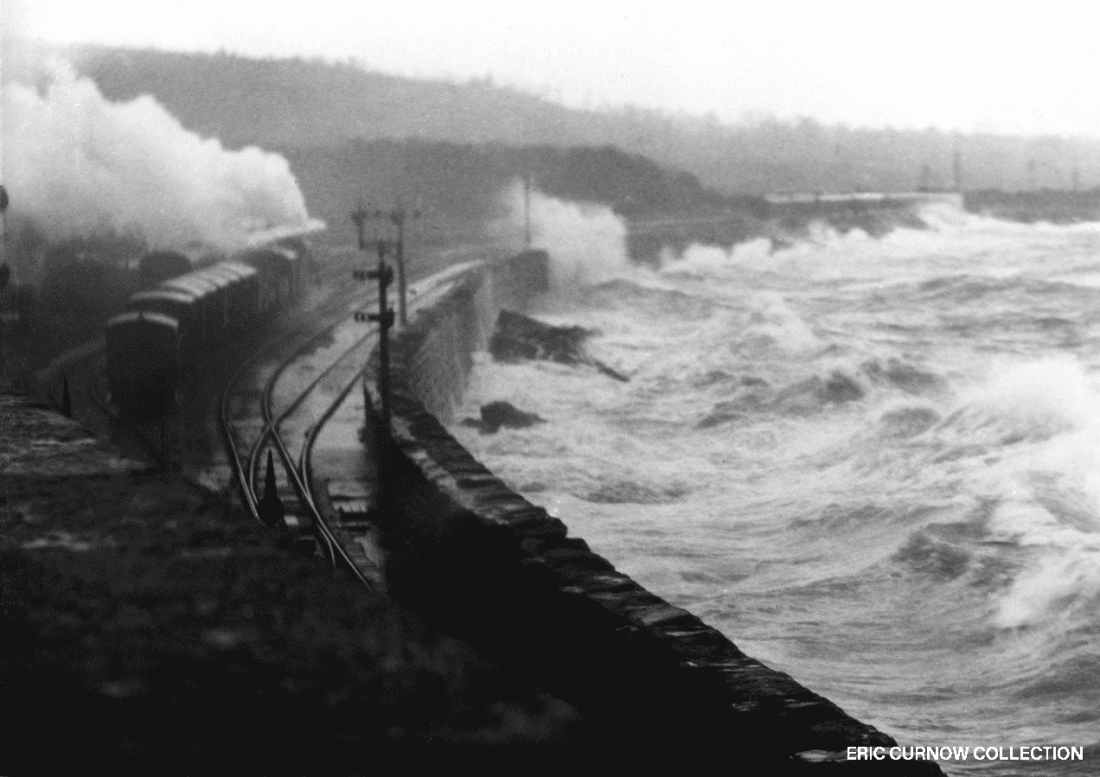 Waves from the Great Storm of 1930 mount up, surge and pound the walls of the railway as a goods train cautiously picks its way out of the station, sheltering a rake of carriages as it does so. The trackbed is saturated with standing water. 3011#AA01-PNZ-WALLS-VI_NE