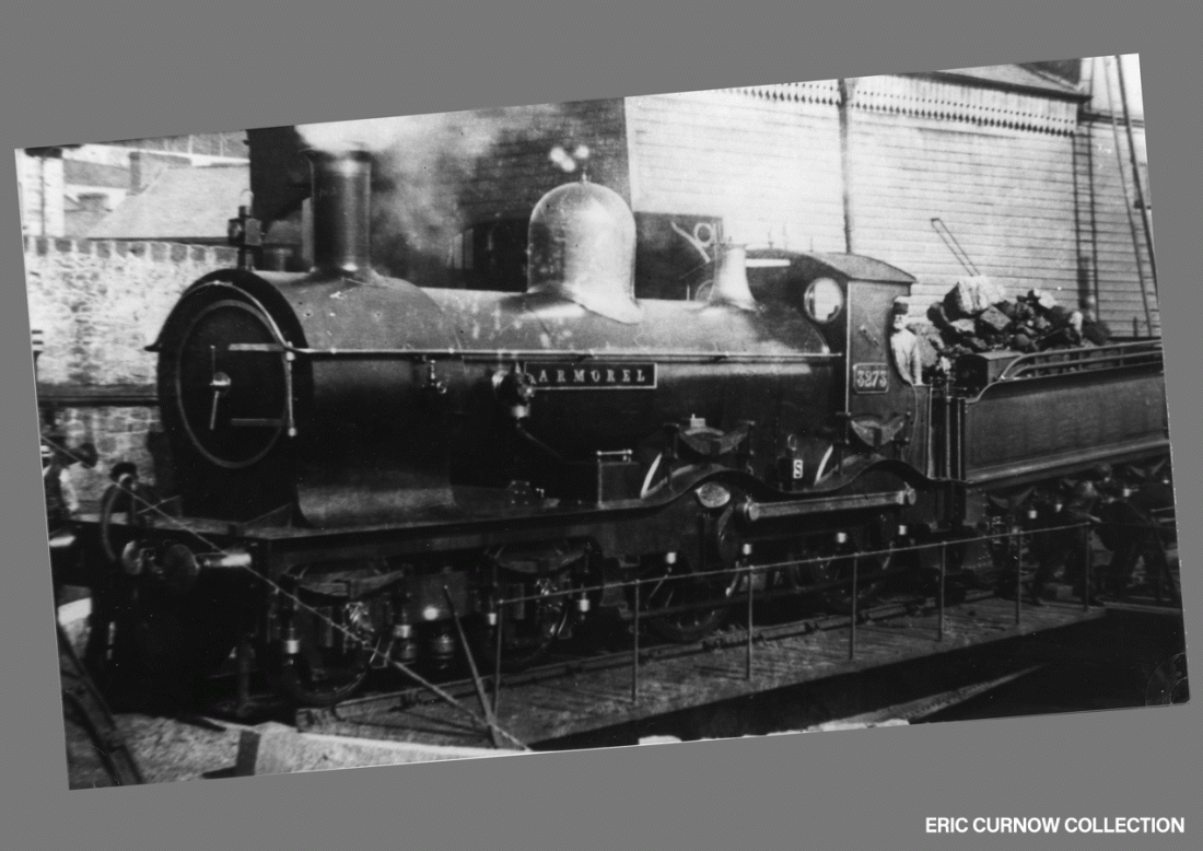 Congestion of Penzance Station’s entry point is obvious in this 1899 view of two locomotives behind 3273 “ARMOREL” on the extended turntable, with two men winding, and just clearing a coach’s buffers and the loco’s coal tender. 99###AA01-PNZ-s3273-TURNT