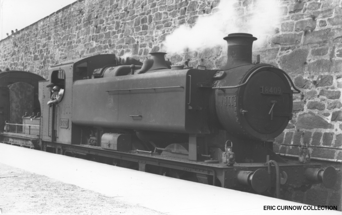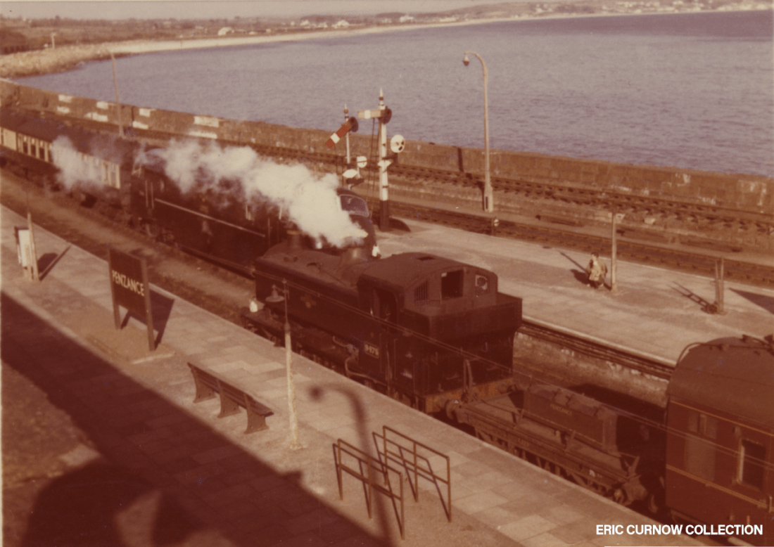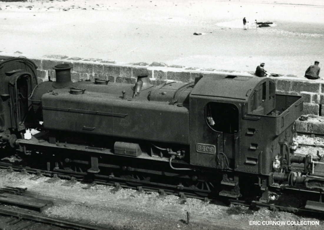 Faces peer over the sea wall and the loco crew lean out of their cab as 8409 gently steams away at the end of a rake of carriages it is soon to remove from Platform 1 of Penzance Station. Between the engine and the carriages is the shunter’s truck – a mode of transport for convenience of the shunting staff as they move from place to place, and their tool store. Photo: Norman Preedy. 510829A01-PNZ-s8409-SHNTG