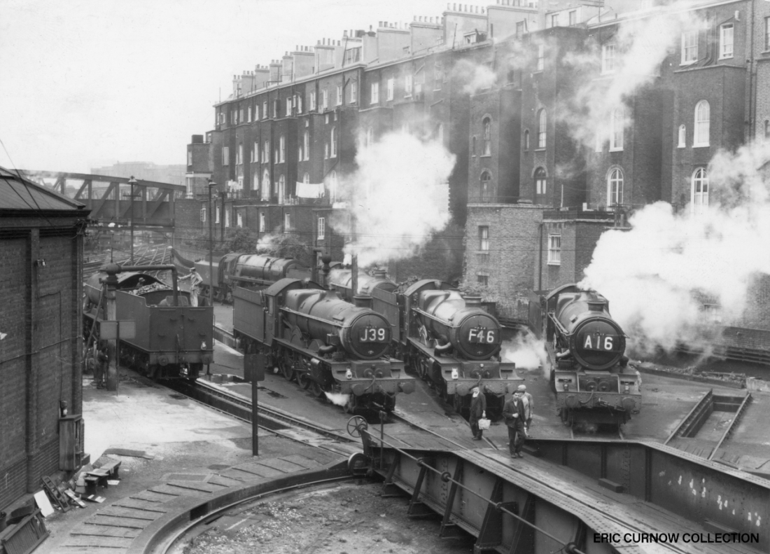 This impressive view of GWR “Castle” locomotives and a BR ‘Standard’ class at Ranelagh yard, looking towards Paddington, is from an official photograph, showing the locos with headcode boards on their smokebox doors, ready to back down onto their designated trains after servicing. The area today is used for parking cars(!) Photo: R.C. Riley. 60###AN01-RGH-S_LCO-PARKD