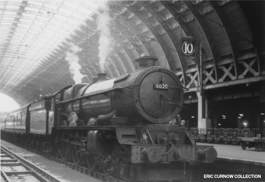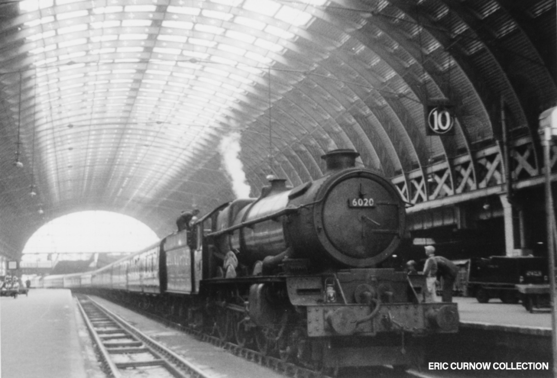 A fireman trims coal on top of the tender of 6020 “KING HENRY IV” as gentle plumes of steam rise from the loco that has arrived with the 12.10pm service from Birkenhead to Paddington on 11th June 1962. Train spotters admire the loco and an array of trolleys await use behind them, but generally the platforms beside it are pretty deserted. 620611A03-PAD-s6020-PAS_U
