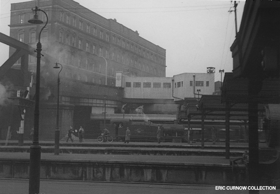 A view across the platforms north eastwards at Paddington Station shows 2-6-2 Tank 6141 being watched by spotters near the end of No. 9 – the loco steaming quietly and probably riding in to withdraw passenger stock to Old Oak Common. Parcels Office and taxi road offices are at the far side of the station – the parcels warehouse being a short distance behind. 620210A01-PAD-s6141-LIGHT