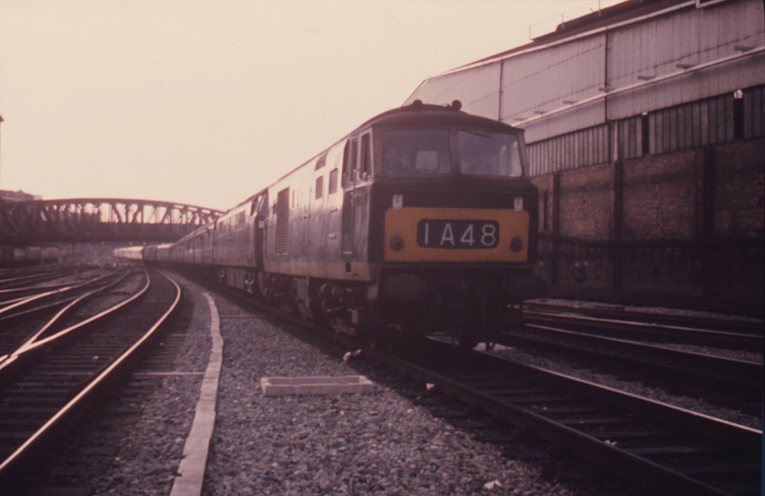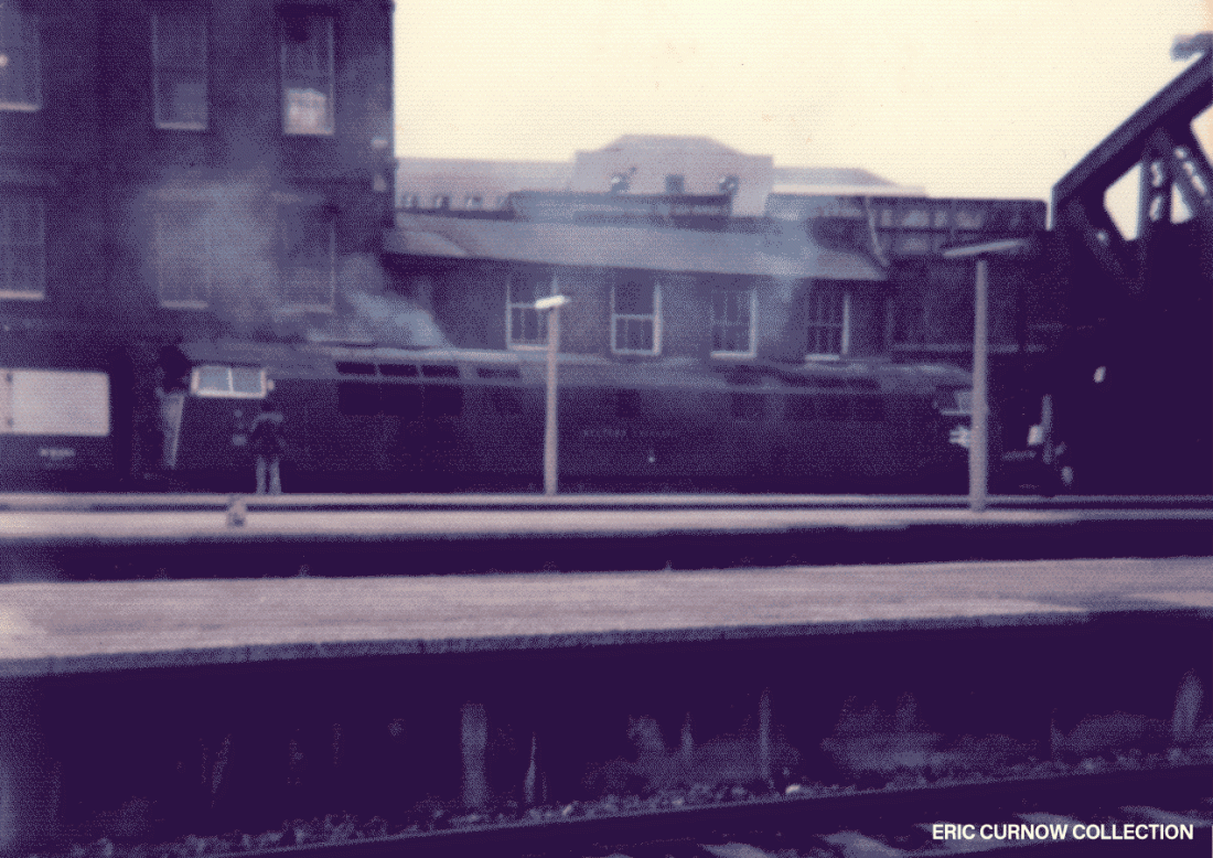 A clever, well-composed and sharp picture of a ‘Hall” class steam locomotive – the centre of attention – interrupted by the arrival of 253006 with an inbound service in 1978 (?). The reporting code numbers have been assembled to read ‘125’ – the maximum speed of the HST units – and the two red lights of the stop blocks are reflected on the smokebox door. 78###AA01-PAD-LOCOS-PAS_U