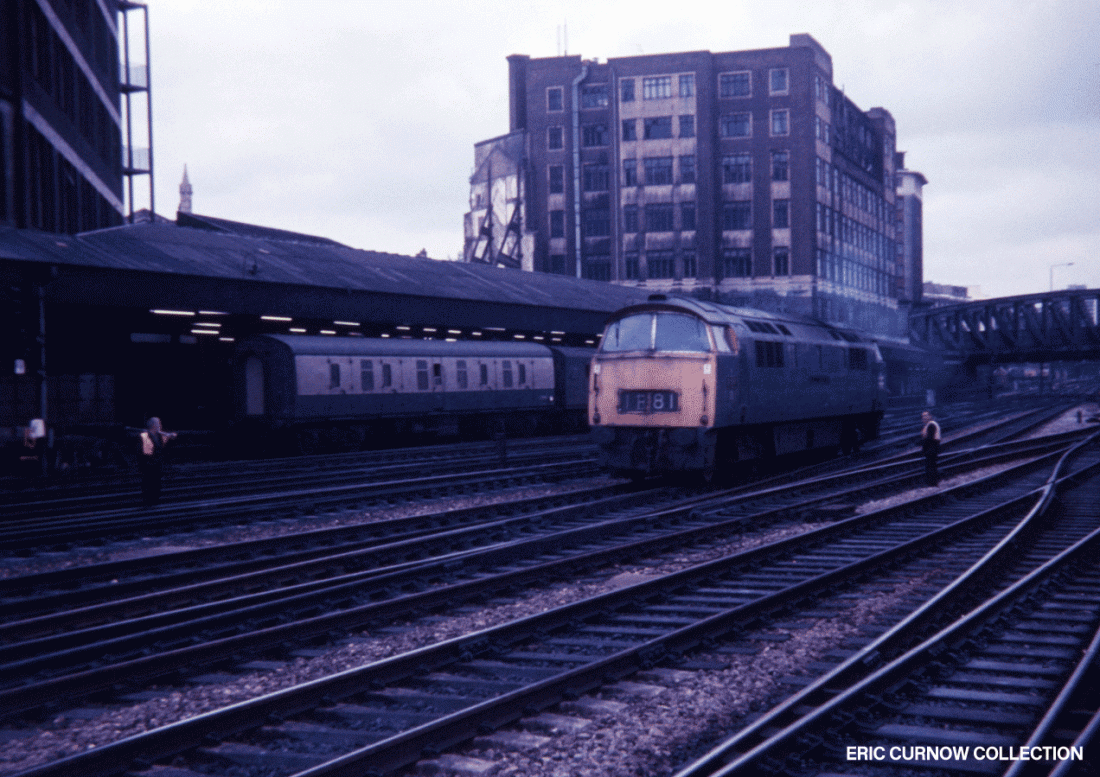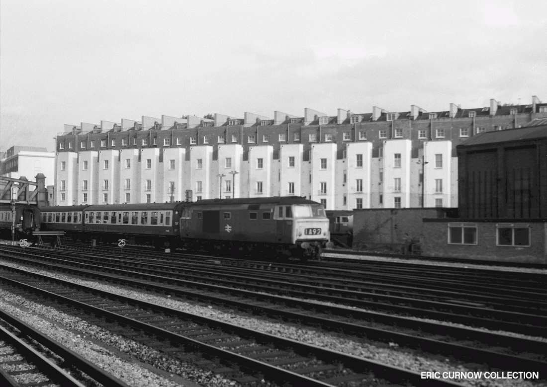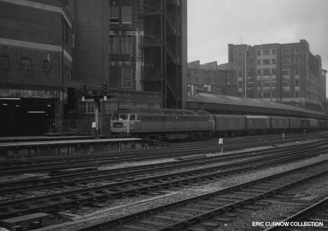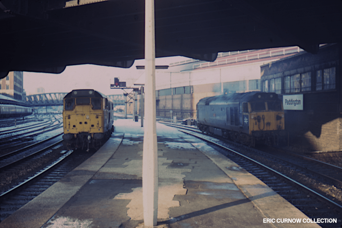 Track workers stand clear as a ‘Western’ smokily runs towards the platforms of Paddington Station in the 1970s. Dominant behind is Enterprise House, an ex-GWR iconic railway administration building, and beyond Westbourne Terrace Bridge lies the stabling point. 7####BE01-PAD-D10##-LIG_U