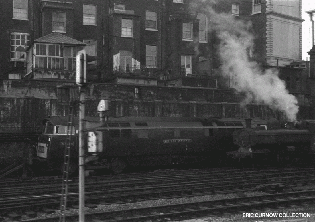 A dismal inner city location does not really enhance D1054 “WESTERN GOVERNOR” , its maroon livery now grimy and exhaust-caked, parked for some reason beside the main lines out of Paddington. An ex-GWR 0-6-0 Pannier Tank steams beside it. 6####AC01-PAD-D1054-PARKD