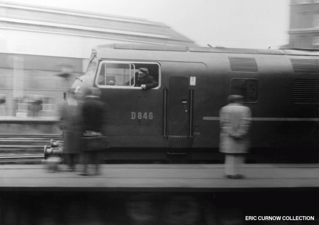 Wary of passengers near the platform edge and time, the driver of D846 “STEADFAST” leans from the cab as the engine runs through Royal Oak Station. In the left background is the stabling point building and to the right are Paddington administrative buildings of BR Western Region. 650206A01-PAD–D846-PAS_D