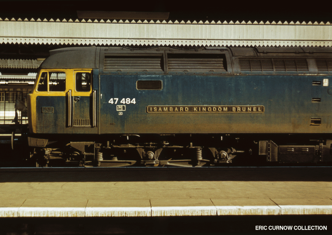47484 ‘ISAMBARD KINGDOM BRUNEL’, bearing the second longest nameplate on a British Rail loco, fittingly waits at Paddington on 26th February 1977 heading a down passenger service. Brunel was the driving force behind the Great Western Railway and the architect of this station – noteworthy legacies of a very remarkable man. 770226A01-PAD-47484-PAS_D
