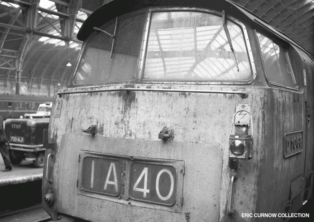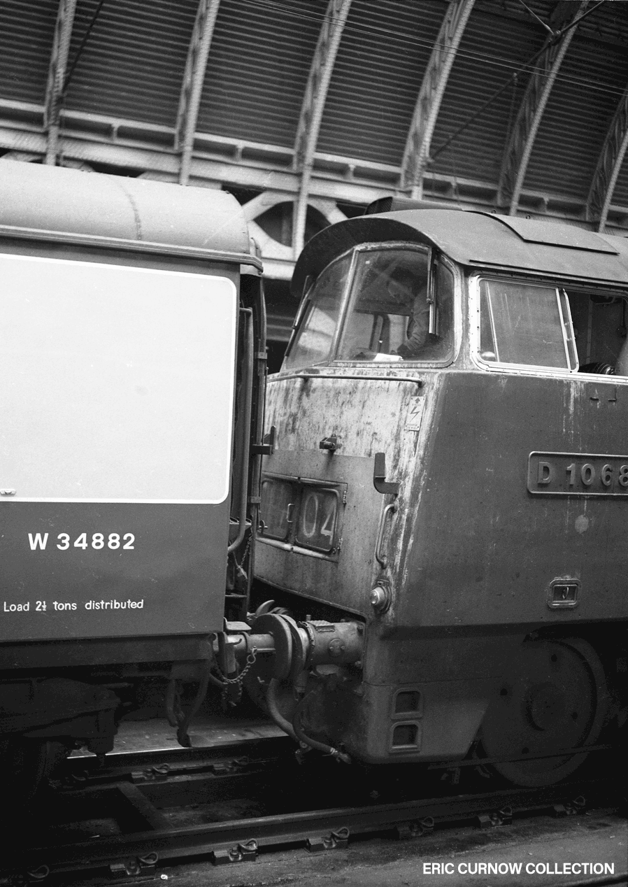 Its exhaust bouncing back from the overbridge, D1065 “WESTERN CONSORT” rolls into Paddington Station watched by a bystander, as an underground train passes in the background. The loco’s paintwork on its battered front end has been virtually stripped off. 6908#AB01-PAD-D1065-PAS_U