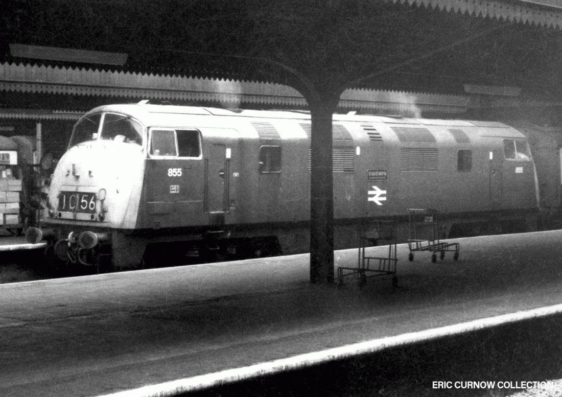 Both engines of 855 “TRIUMPH” are running as it awaits departure time with a down passenger service at Paddington Station. It’s buffer heads are still largely silver – suggesting a recent outshopping from the Works – and BRUTES loaded with parcels are nearby. 7####DH01-PAD—D855-PAS_D