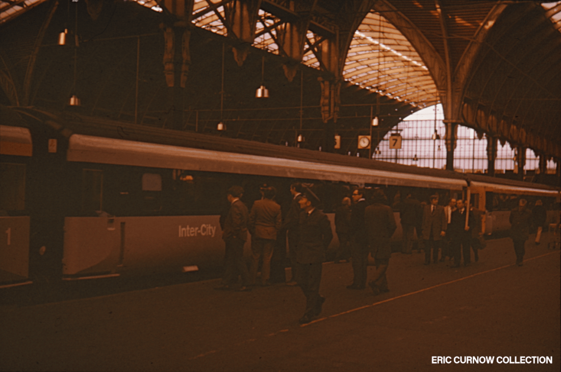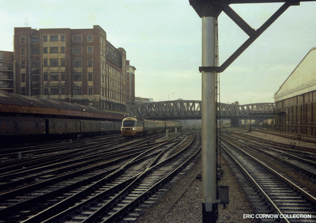 Though slightly marred with exhaust staining, the prototype HST, shiny and glinting reflected light, is in virtually pristine condition as it rolls into the platforms at Paddington Station. Behind it is the Goods Depot and Westbourne Road Bridge – before it are the tracks on the departure side of the station – similarly shining in the diminishing light. 7####FV01-PAD-2~001-PAS_U