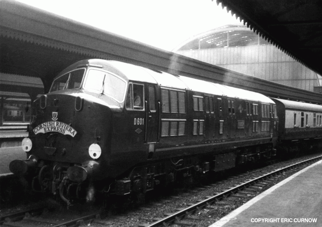 D601 “ARK ROYAL” heads the ‘Cornish Riviera Express’ at Paddington Station on 9th September 1959. With green paintwork, chocolate and cream coaches behind, and a curved steam-age headboard, the scene is strongly reminiscent of the GWR. 580909A01-PAD—D601-PAS_D