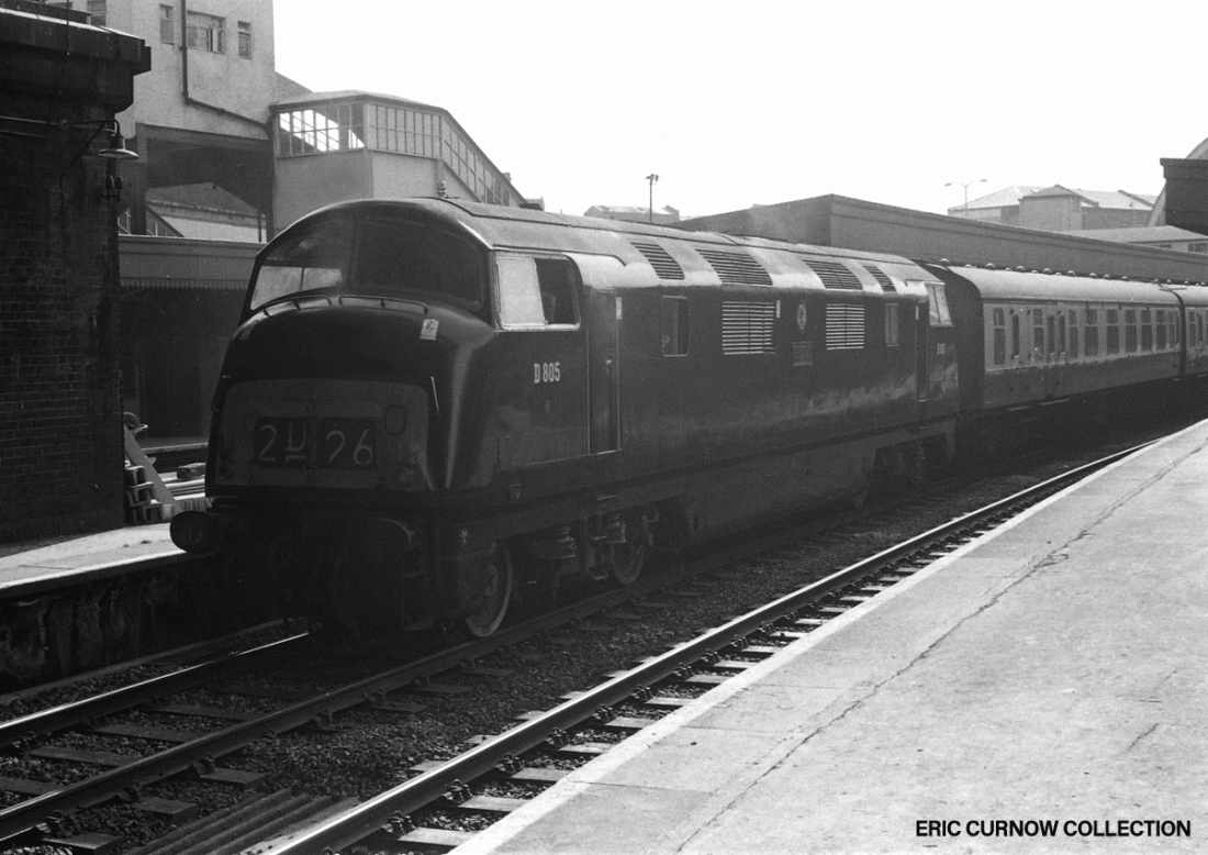In glossy maroon livery, D805 “BENBOW” sits at the head of a passenger service at Paddington Station, with a rather unusual headcode displayed. Beside it is the stantion of a huge overbridge, that provided shelter for platform-end enthusiasts when it rained. 670620A01-PAD—d805-PAS_D