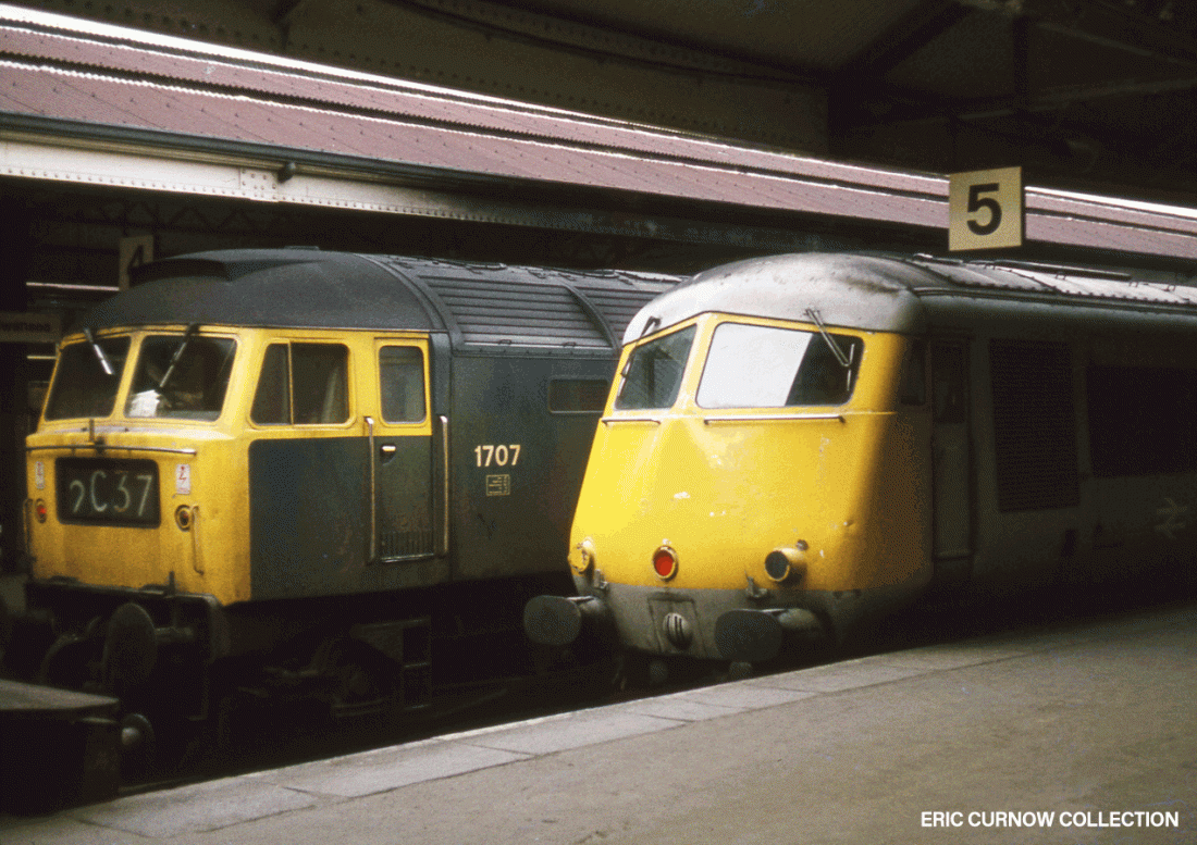 Brush Type 4 No. 1707 waits with a down service beside a Pullman unit at Paddington Station in 1972 – some sort of flat-bed truck is before the latter, blocking its exit. I always thought the reverse of the BR blue colour scheme entirely appropriate for these units – visually they were very attractive industrial design. 72###AF01-PAD-DLOCO-PAS_D