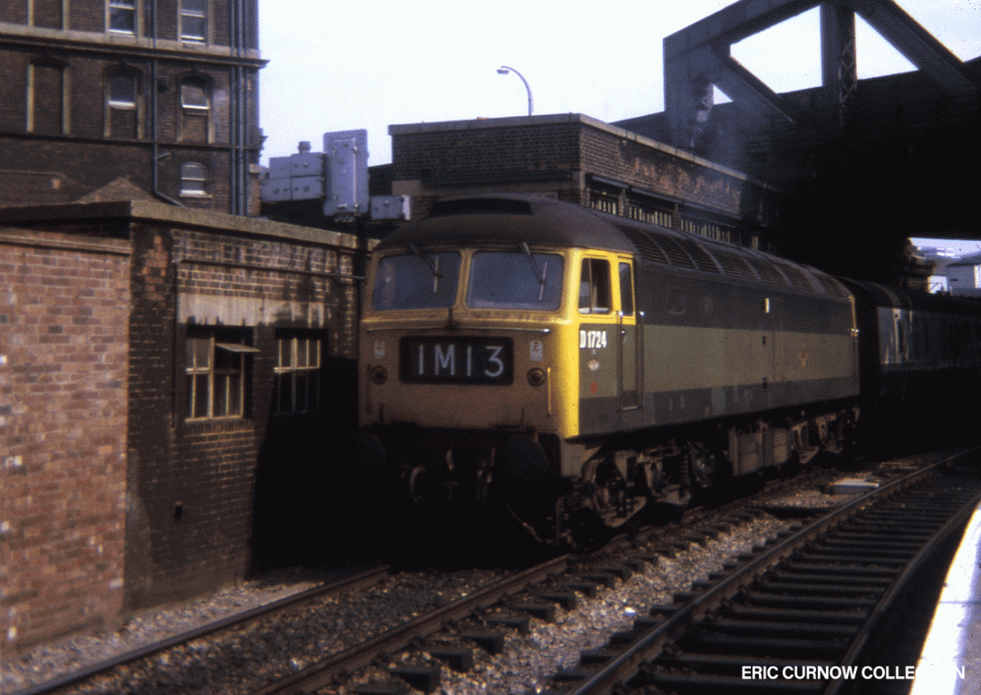 Before a grimy Paddington Arrival Signal Box waits D1724 in 1968 with an outbound passenger service. It is in two tone green livery; has lost the builder’s plate from the near cab side; displays the red Route Availability dot, and has a W.R. “W” under its number. 68###AD01-PAD-D1724-PAS_D