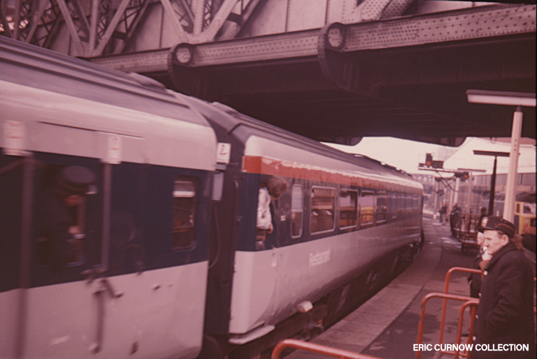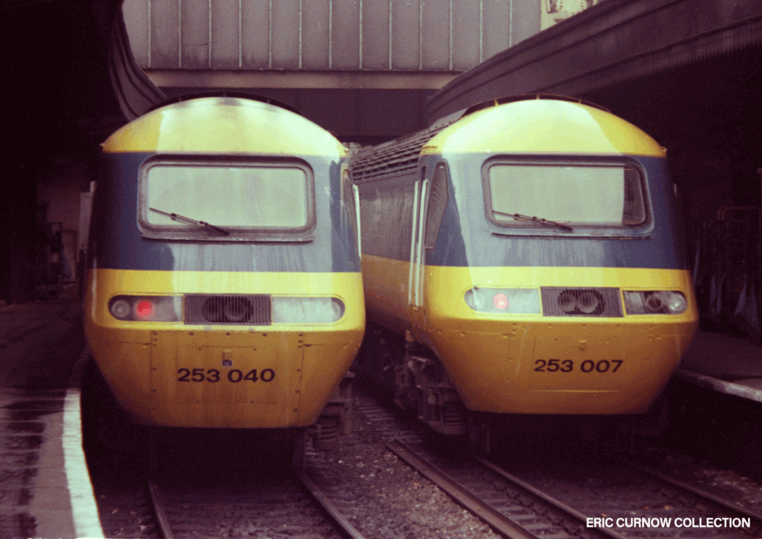 Sunlight gleams from the front ends of two HST sets at Paddington station in this well composed shot of the arrivals in 1982 – on the left is 253040, and the other 253007. The plain tarmac surface of the platforms leave much to be desired and the glossy locomotives contrast nicely with their mundane backgrounds. 821230A01-PAD-2~XXX-PASGR