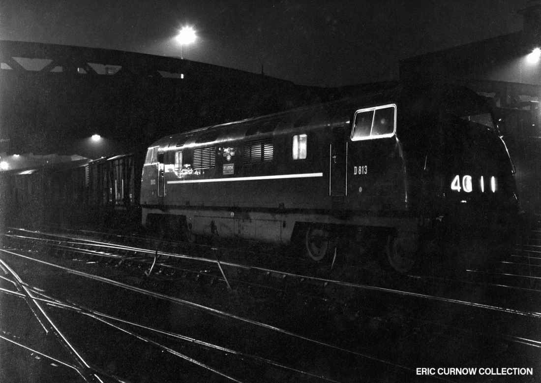This BR promotional shot features D813 “DIADEM” in green livery, leaving Paddington Station with a van train at night. Above the train is “Bishop’s Bridge”, and in the foreground, surprisingly, points levers – that you might expect to be Signal Box controlled here. 6####EK01-PAD—D813-GDS_D