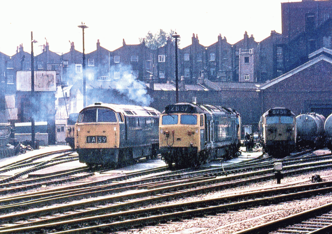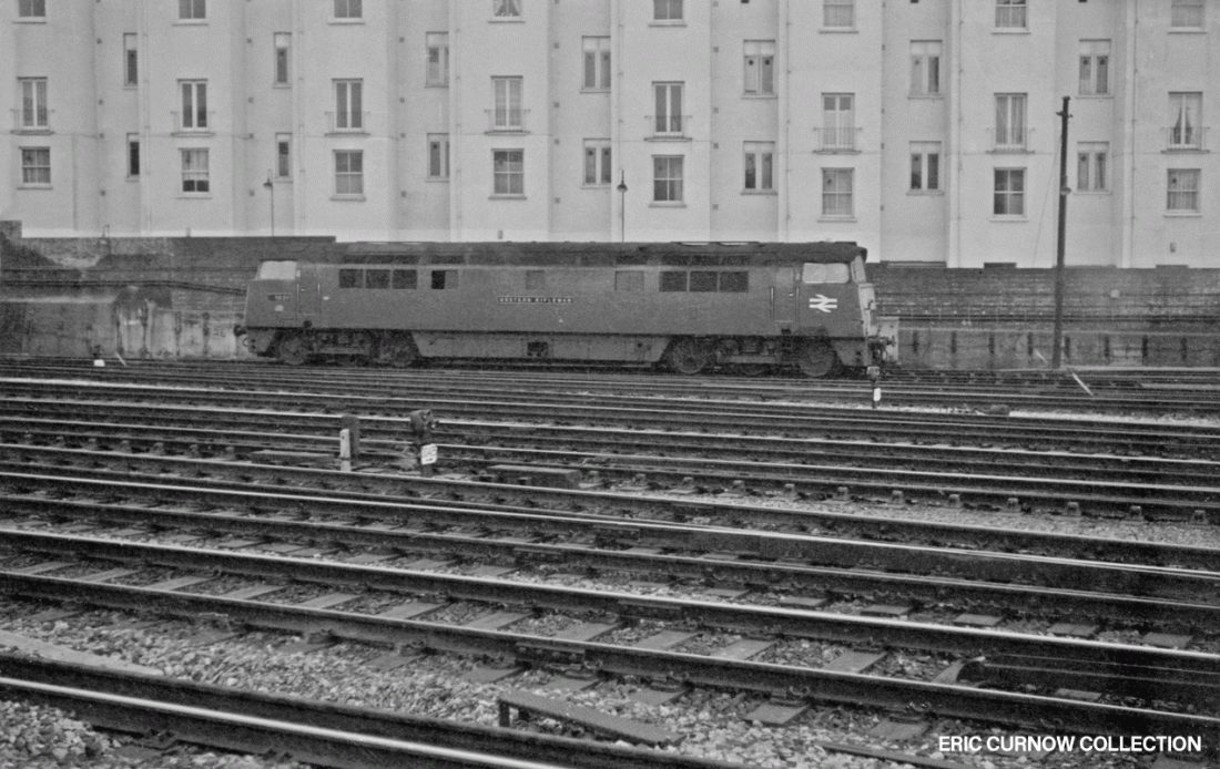 The driver of a ‘Western’ running in to pick up a train at Paddington Station leans from the rear cab as it approaches rather fast. Behind it are the Metropolitan tracks and the huge goods shed, covering several acres, bearing a yellow National Carriers sign. 7####BN01-PAD-D10##-LIG_U