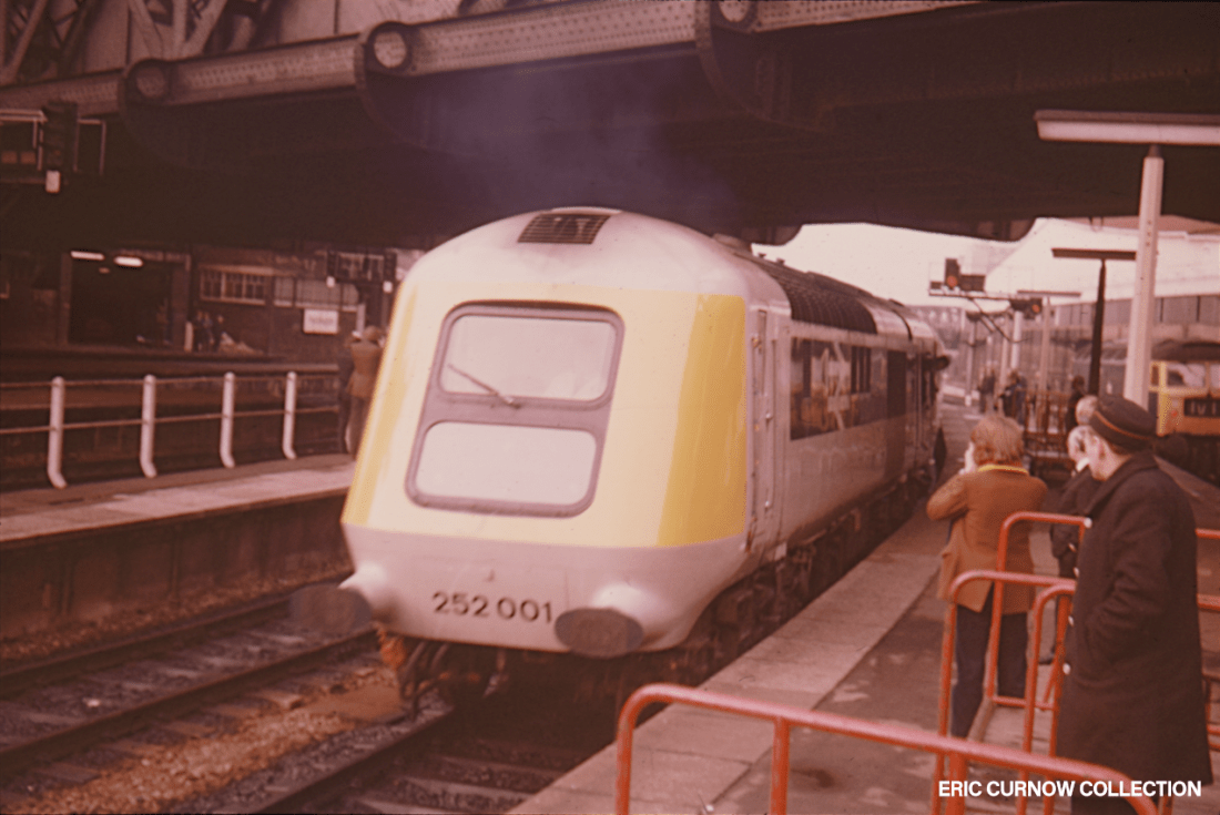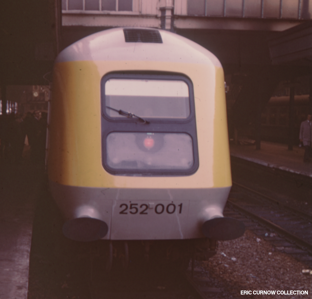On the first day of regular service, 252001 arrives at Paddington Station, surrounded by the curious to see or travel on this new, shiny train. It is finished in the Pullman livery, with broad horizontal stripes at cantrail height distinguishing first from standard class and catering cars, and the front and rear ends show the unique positioning of the warning lights. 750505A00-PAD-2~001-PASGR
