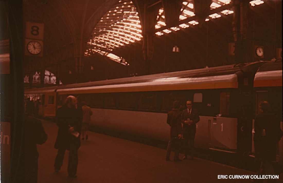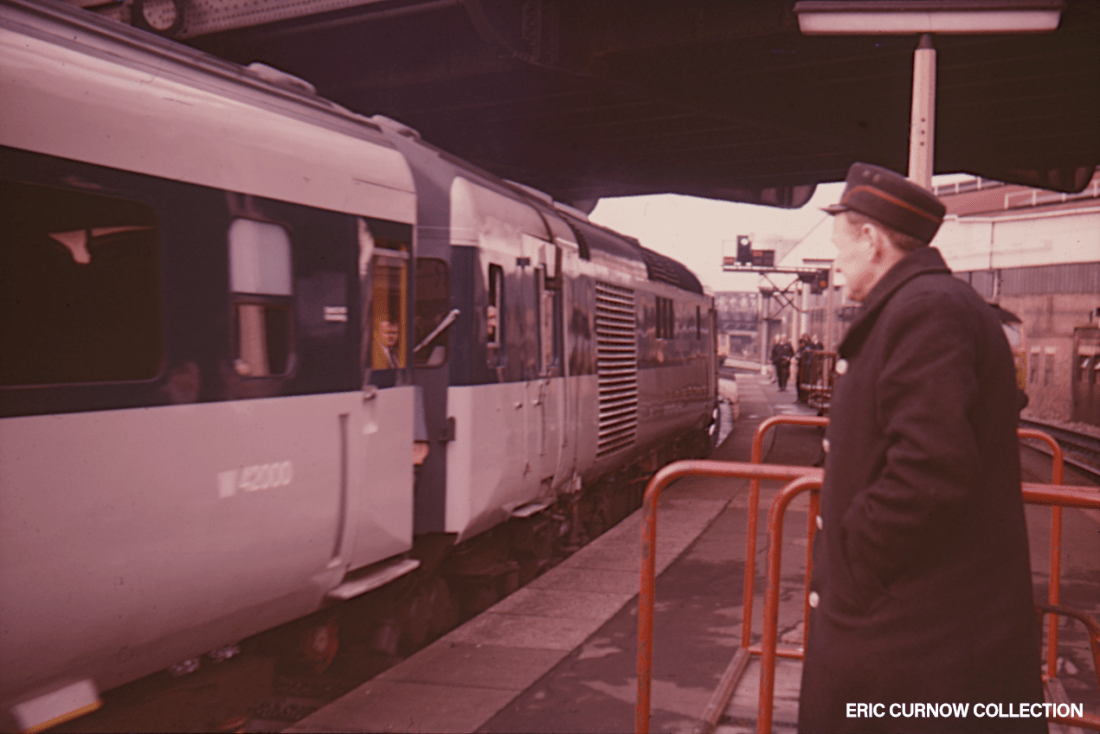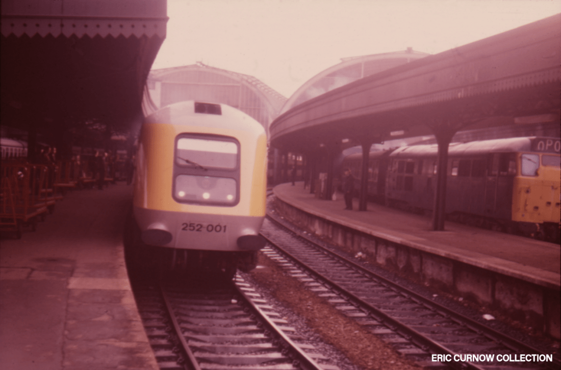 D1034 “WESTERN DRAGOON” and the prototype High Speed Train set are side by side at Paddington Station awaiting departure. I didn’t see 252001 until it was in preservation, though it did once visit Penzance. The normal station parcel traffic goes on around them. 7####BZ01-PAD-D1034-PAS_D