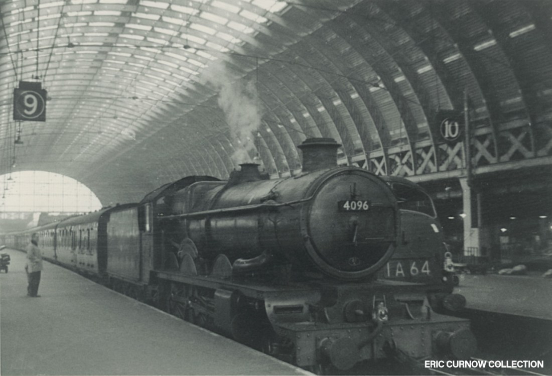 4096 “HIGHCLEVE CASTLE”, allocated, as the smokebox door ’81A’ shedplate shows, to Old Oak Common three and a half miles back down the track, has arrived at Platform 9 with the 12.05pm Hereford to Paddington on 10th February 1962. Before it is an admirer, and behind is a ‘Warship Class’ diesel in green livery, and an empty parcels area. 620210A02-PAD-s4096-PAS_U