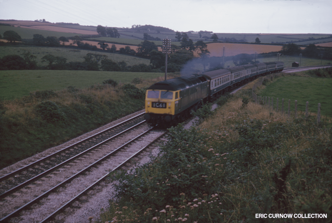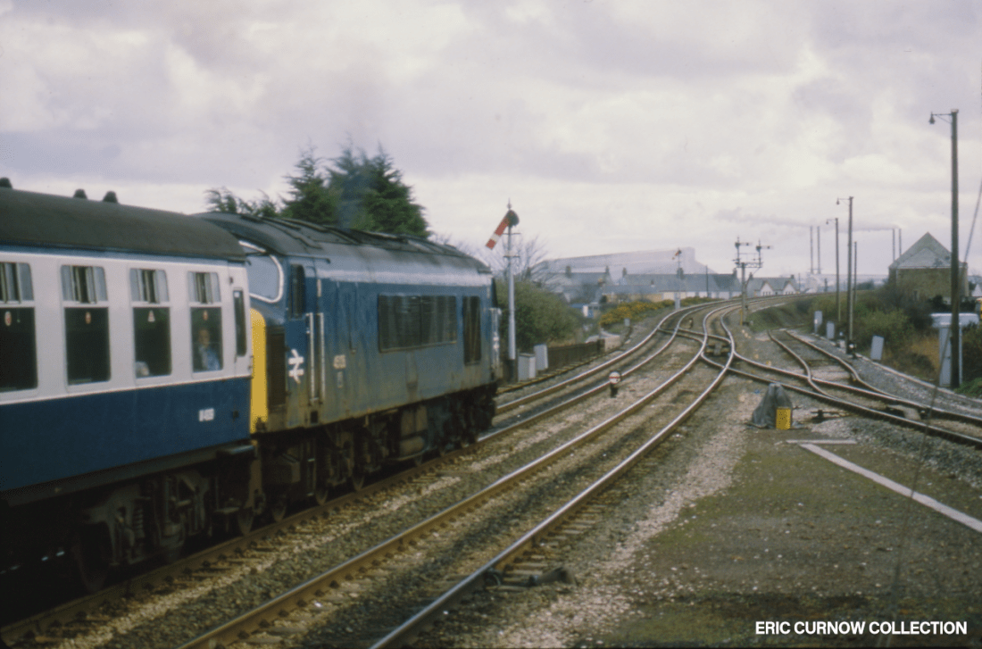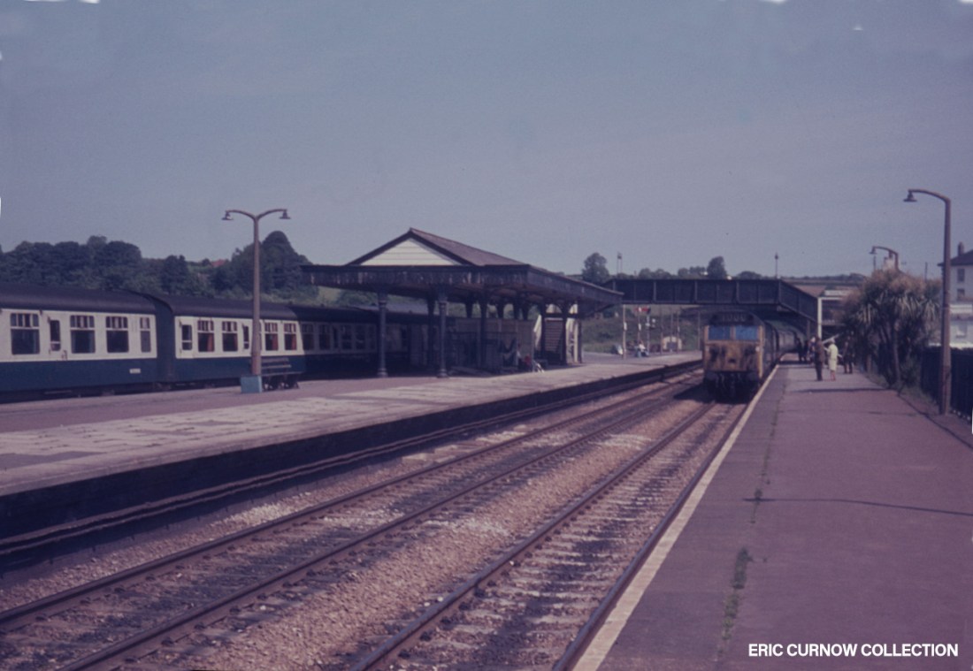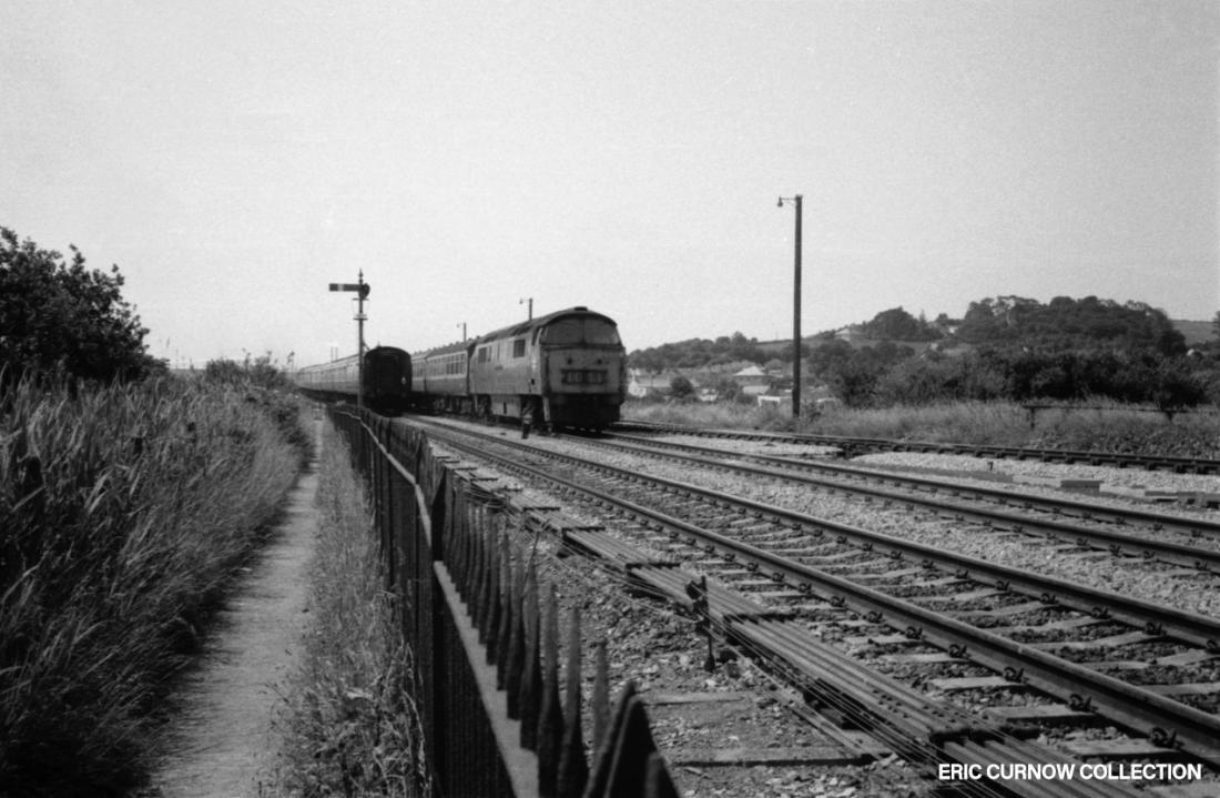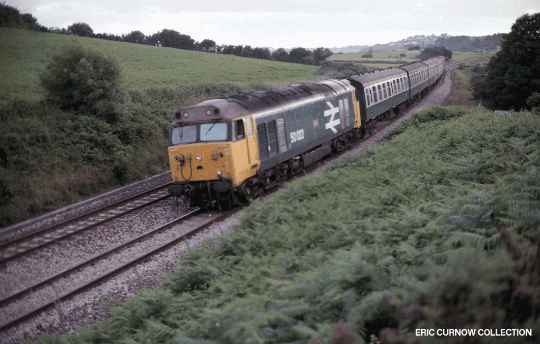 A dirty Class 50 on a Penzance service with headcode set to zeros slows to pick up passengers at Par Station in 1976 – a drought year when saving water precluded cleaning trains. A rake of Newquay line coaches is on the far side of the island platform, and the bright sun casts deep shadows across it, but lightens the palm trees beside the down platform. 76###AL01-PAR-50###-PAS_D