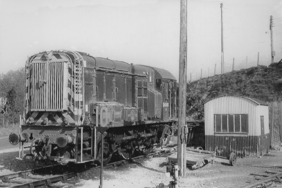 Wearing tinges of rust and china clay on the edges of its panelling and a wheel rim, a D4### series shunter is pictured in the bay at Par Station in the lee of the incline to the overbridge. Beside it is a GWR-painted corrugated iron storage shed – possibly the lamp store – and before it a ’10 MPH’ speed restriction sign for trains leaving the island platform to join the main line east. 7####HM01-PAR-D4###-PARKD