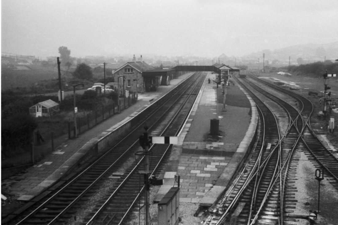 A misty view of the station and trackwork from the overbridge at Par looking west, with a couple of scissor crossings, plus a spur to the right where the station pilot rested. In the distance beside the nearly hidden signal box lurks a Class 25, and the space to the north of the site has been cleared of the loading paraphanalia, where once a pre-GWR goods shed existed. 7308##C01-PAR-STATN-VI__W
