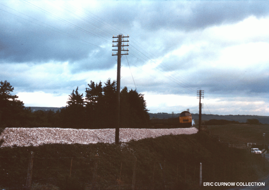 It is misty as D1059 “WESTERN EMPIRE” comes off the Newquay branch as it pulls into Par Station with a through service to Paddington in 1974. The distinctive semaphores stand sentinel beside the Signal Box as the signalman hurries to collect the tablet as the engine passes. Below the right signal is the chapel that the siding beside it got its name from. 740912A01-PAR-D1059-PAS_U