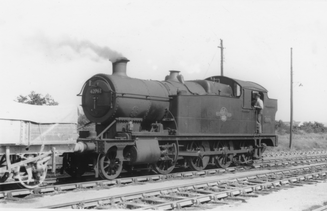 Large tank engine 4206 smokes quietly as it awaits departure with a china clay train at Par on 11th July 1958.With its large firebox and side tanks it really “looks the business” for pulling such trains, of many covered wagons slowly creaking, clanking and groaning as they were hauled along jointed track in less than the finest of condition. 580711A01-PAR-s4206-PARKD