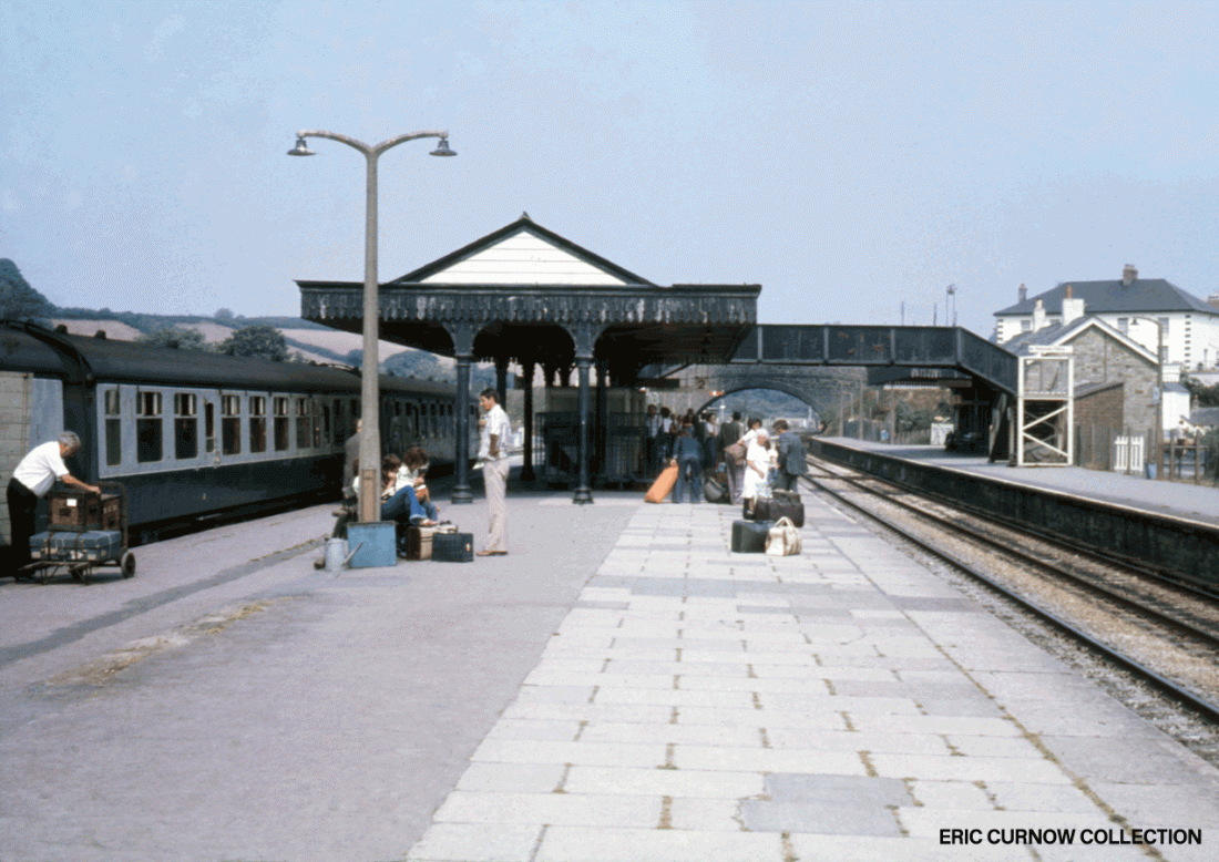 Passengers from the Newquay Branch train on the left await an up passenger service at Par Station in the Indian Summer of September 1976. A porter is loading a trolley with a suitcase and brown mail boxes, and Brute trolleys lie under the awning before the seat shelters, that looks badly in need of repainting in brighter colours. 7609##A01-PAR-STATN-VI__E