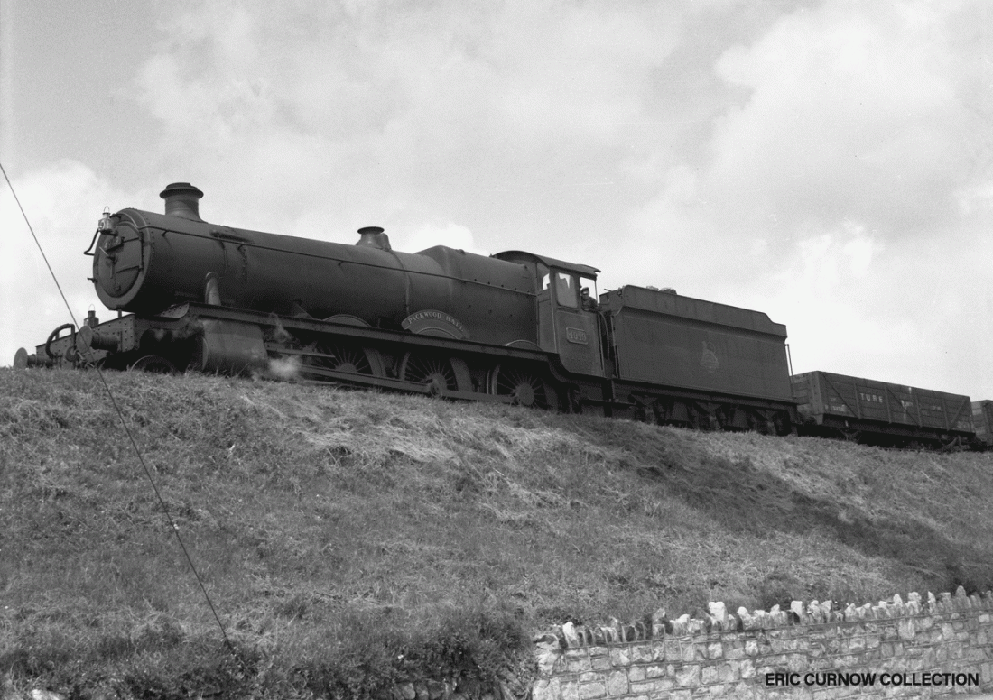 4949 “PACKWOOD HALL’ hauls a goods up the embankment towards St Austell, close to Carlyon Bay Golf Club on 28th June 1956. Judging by the absence of steam leaks, and the fireman hanging over the cab side instead of shoveling, it seems there is enough steam available for the climb. Photographer: T. Martin. 560628A01-PAR-s4949-GDS_D