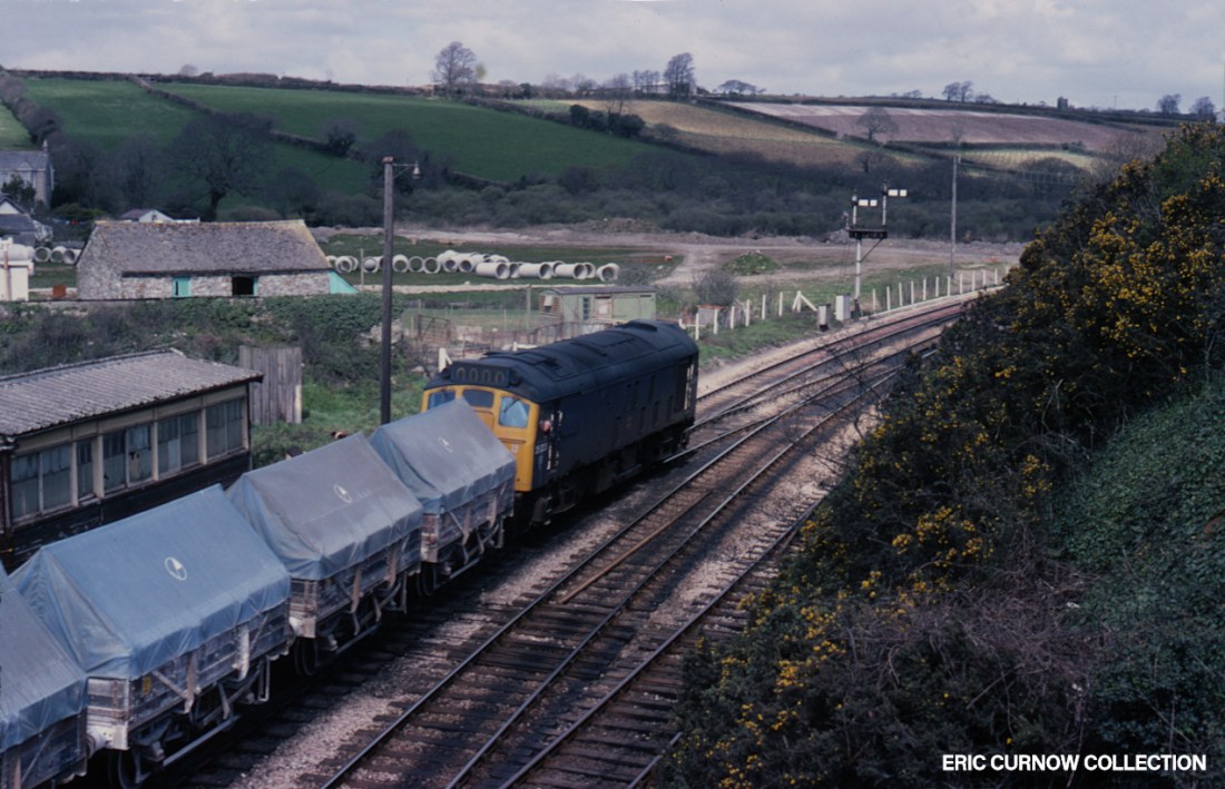 The guard of a train of china clay “hoods” looks back to check the integrity of his train as it draws out onto the main line at Par Station in April 1976. The train engine seems to be 25213, and it appears to be transferring to the down main. The carriage/hut to the left is the railwayman’s club, and pipes on the field behind suggest development there is imminent. 7704#AD01-PAR-25###-CCLAY