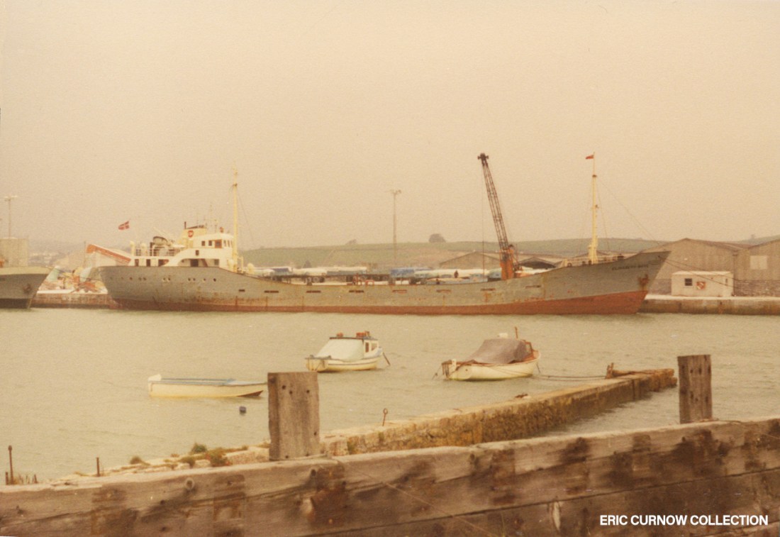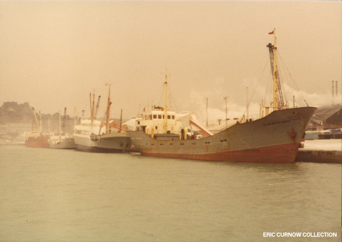 The “ELIZABETH BOYE” is pictured in the late 1970s being loaded and leaving the Port of Par with china clay. The phallanx of ships show what a sizeable operation the business is, though rail access was very sparce at this time, with pipelines supplying the minerals. Apparently this ship was owned by Erik B Kromann, a Danish company. 7####HG01-PAR-E_BOY-MOORD