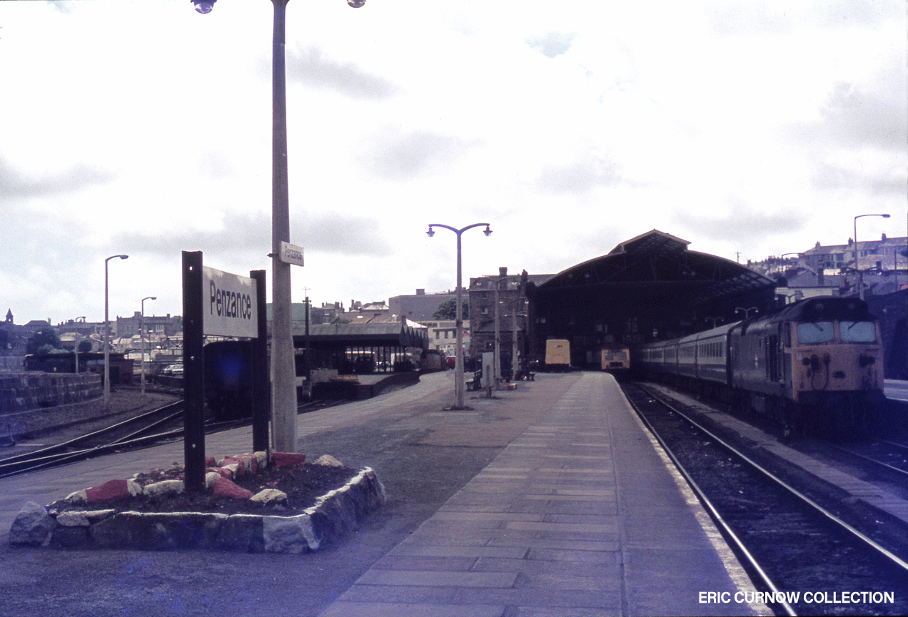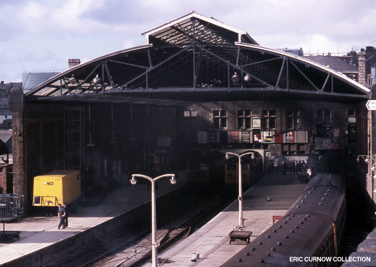 This 1970s view of the front of Penzance Station building shows the complete removal of the weather screens, and additional spotlights subsequently fitted. A 47 and 50 lurk in the shadows and passengers wait at the barrier to board the DMU service. 7####AW01-PNZ-STATN-VI_SW