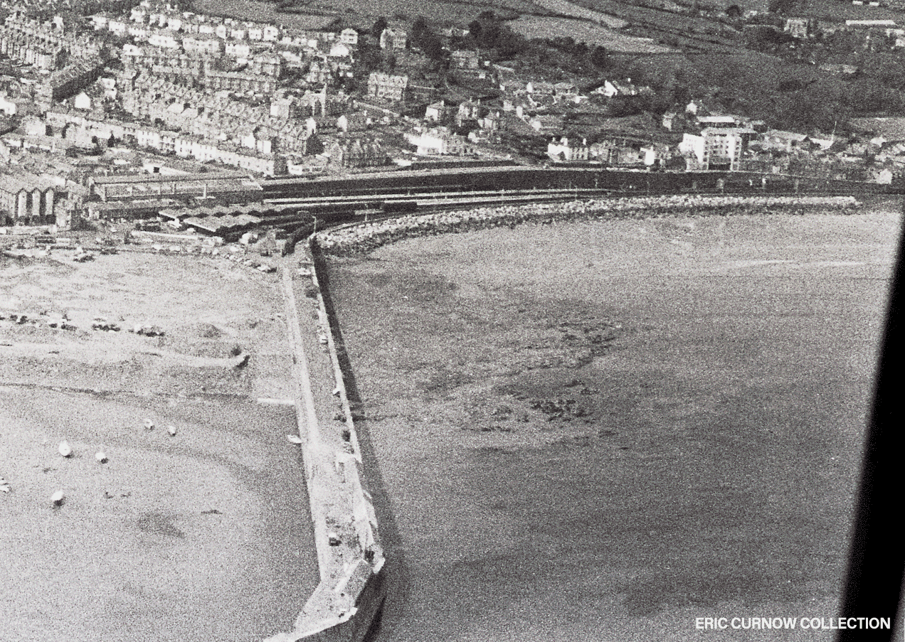 This 1966 view from the Isles of Scilly helicopter shows a northern view of Penzance Station. The station yard is above the end of the pier, with covered goods area to the left, station train shed above those, and platforms extending eastwards. 660507A04-PNZ-STATN-VIS_N