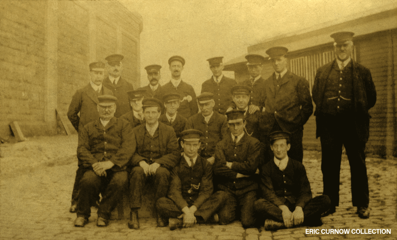 A fairly impromptu portrait of staff at Penzance Station in the 1920s, taken between the side of the main building and the wall of the first engine shed beside it – a little of the awning of the goods shed is just visible behind that. Distinction of rank seem largely relaxed, as a mixture sit on boxes, on the granite setts in front, or stand behind. 2####AH01-PNZ-STAFF-POSNG
