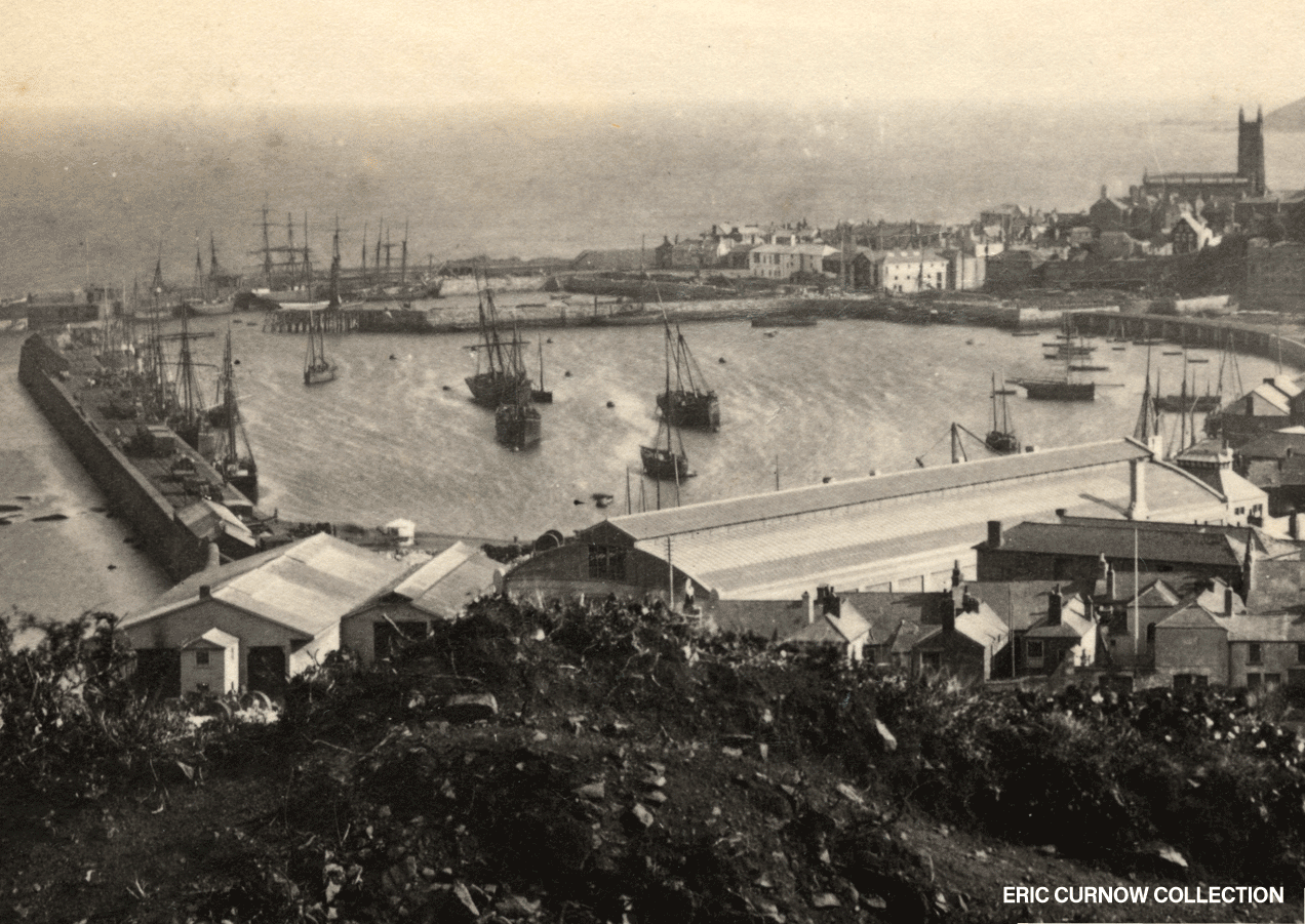 An early view, but probably taken after what seem like excavations of the castle site, debris from which now covers the former hedge and gate. The tide is in, there is activity in the Goods Shed, and goods wagons are on the quay. #####AD01-PNZ-STATN-VIS_S