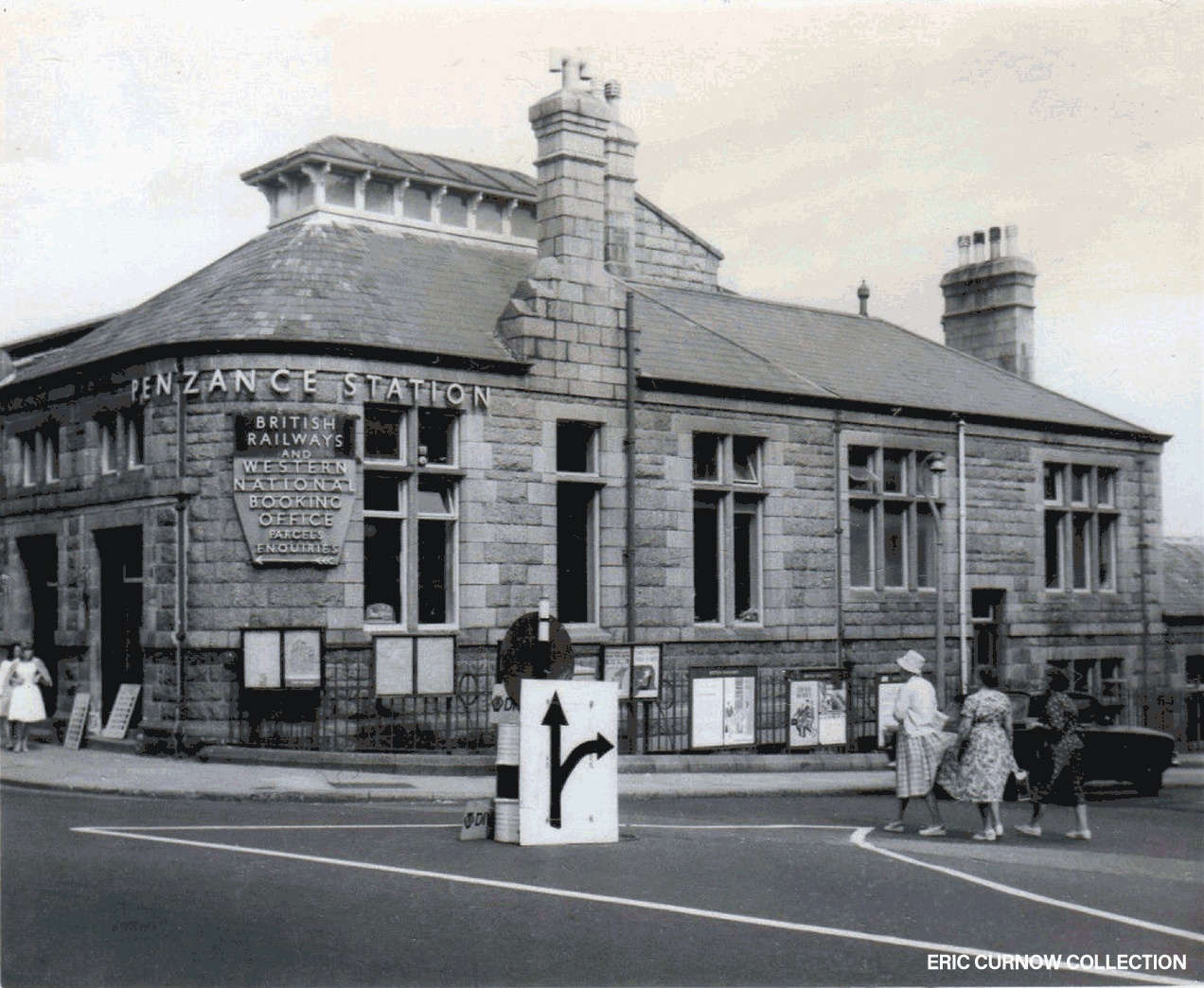 Western National’s advertisement has now been joined by a stove-enameled British Railways sign and illuminated ‘Penzance Station’ lettering on the corner of the building. A revised traffic system is being trialed. 6####AO01-PNZ-S_BLG-VI_NE