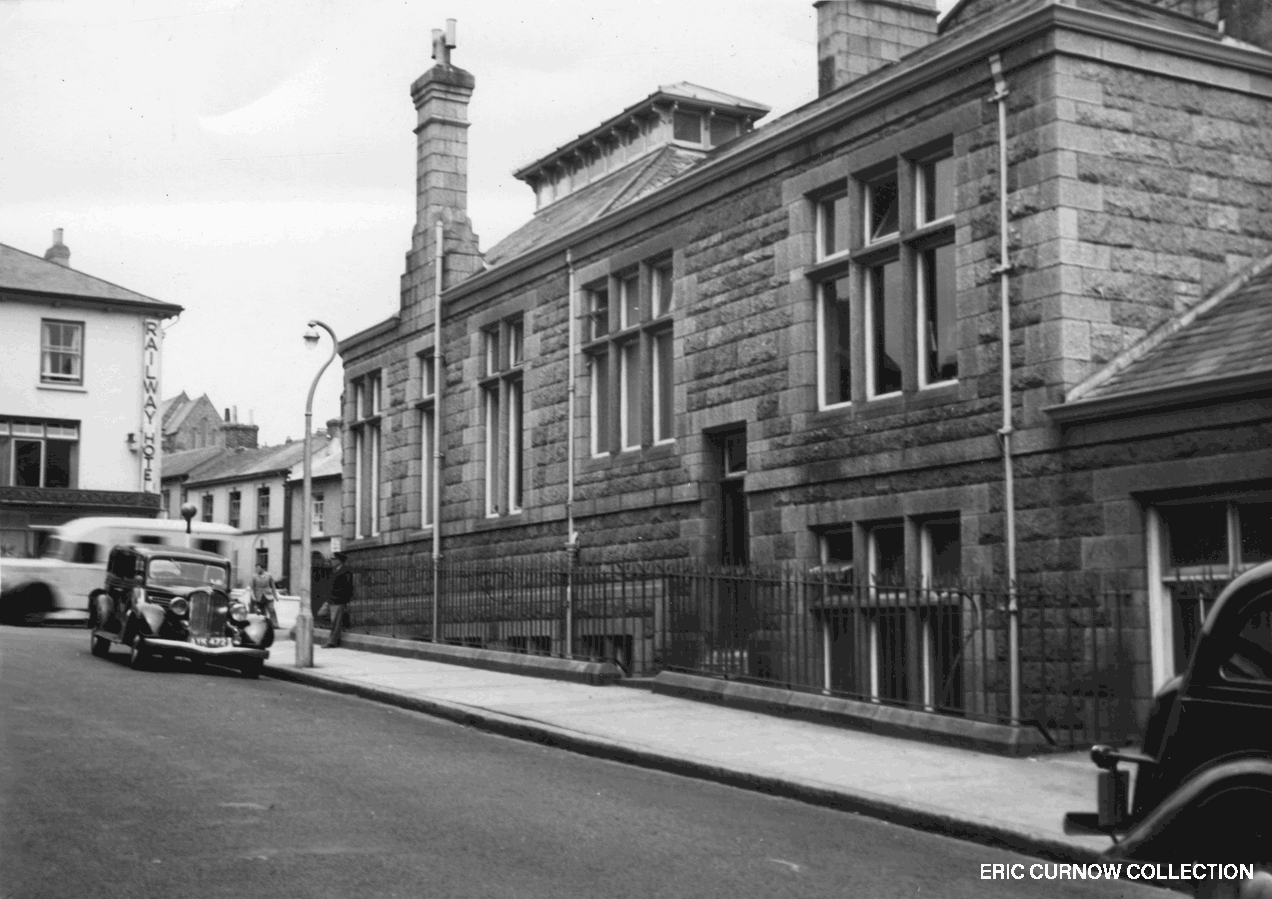 This is the town-facing elevation of Penzance Station looking north, with the staff entrance just right of centre. An ambulance rushes up the main street between the station entrance and the Railway Hotel. 5####AC01-PNZ-B_BLG-VI__N
