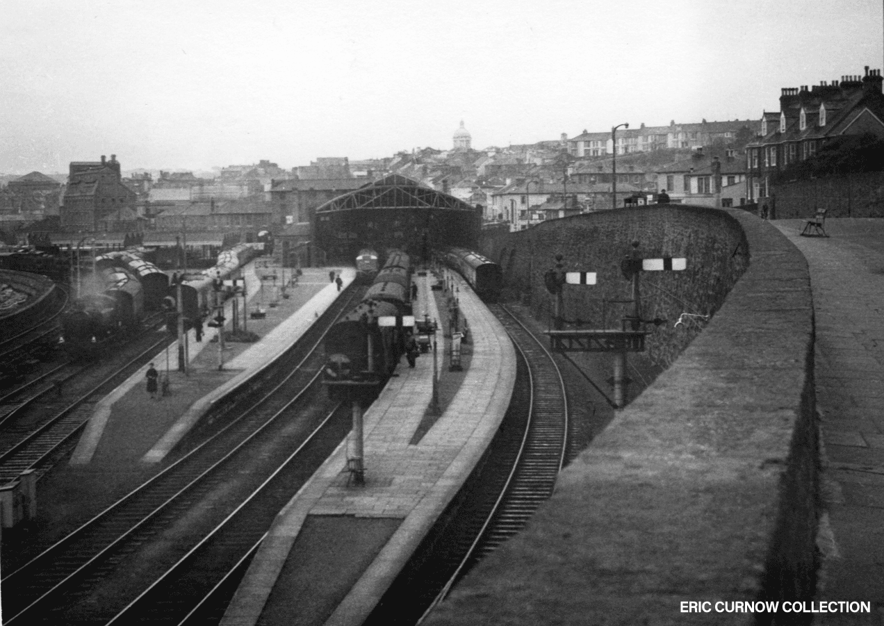 People climb the steps to what was then the Booking Office cum main street entrance at Penzance Station, while others make their way through the ticket gates onto the platforms, or talk to the man inside Wyman’s Bookstall. Behind the coaches in maroon livery is a D8XX Warship that has brought in an earlier service and a plethora of interesting signs. 63###AI01-PNZ-STATN-CNCSE