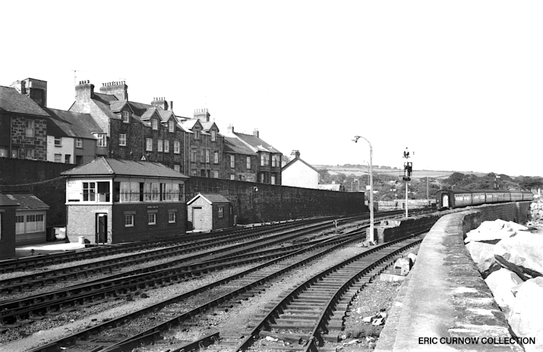 Built on the site of the second Engine Shed, this is the second Signal Box at Penzance – its nameplate is in the GWR style with white lettering. The road behind is extremely narrow at this point, with no pavement on the nearest side. 6####BI01-PNZ-SIG_B-VI__N