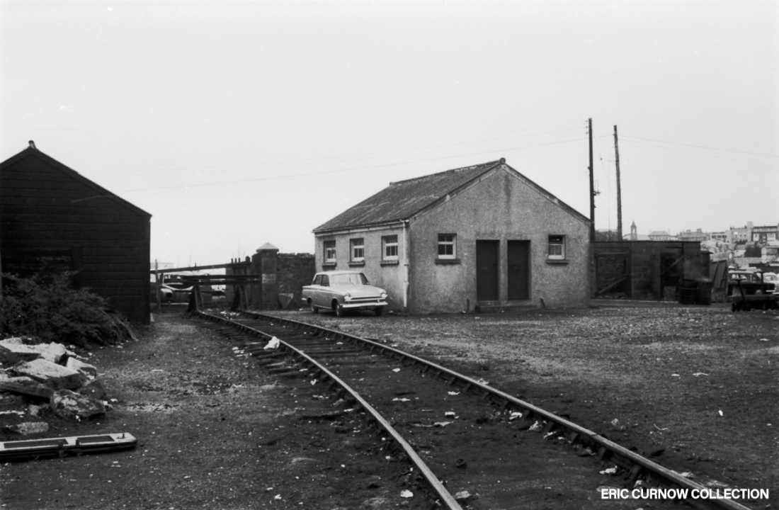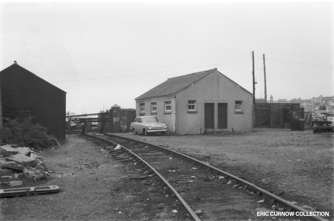 These buildings at the south western tip of the station yard were demolished shortly before my interest in railways began – replaced by a wall of pre-cast concrete uprights and slats, where the granite wall is shown here. The track here once ran onto Albert Pier, where embedded rail remains can still be seen. The main building seems to be a social area for station staff. 6####IX01-PNZ-BLDNG-VI_SW