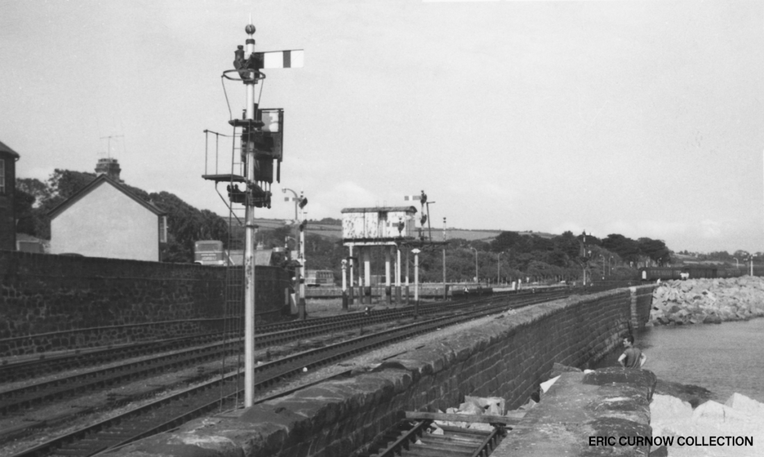 Beside the end of the sea wall crane road, terminated with a wooden sleeper, was a signal with interchangable boards that indicated where the movement off the siding would end up – PLTFM 2, or whatever. Beyond it across the track there are more signals, the Water Tank and a water crane – as a car came up the slope behind them, the nearest signal would dominate the view. 6####IY07-PNZ-SGNLS-VI__N