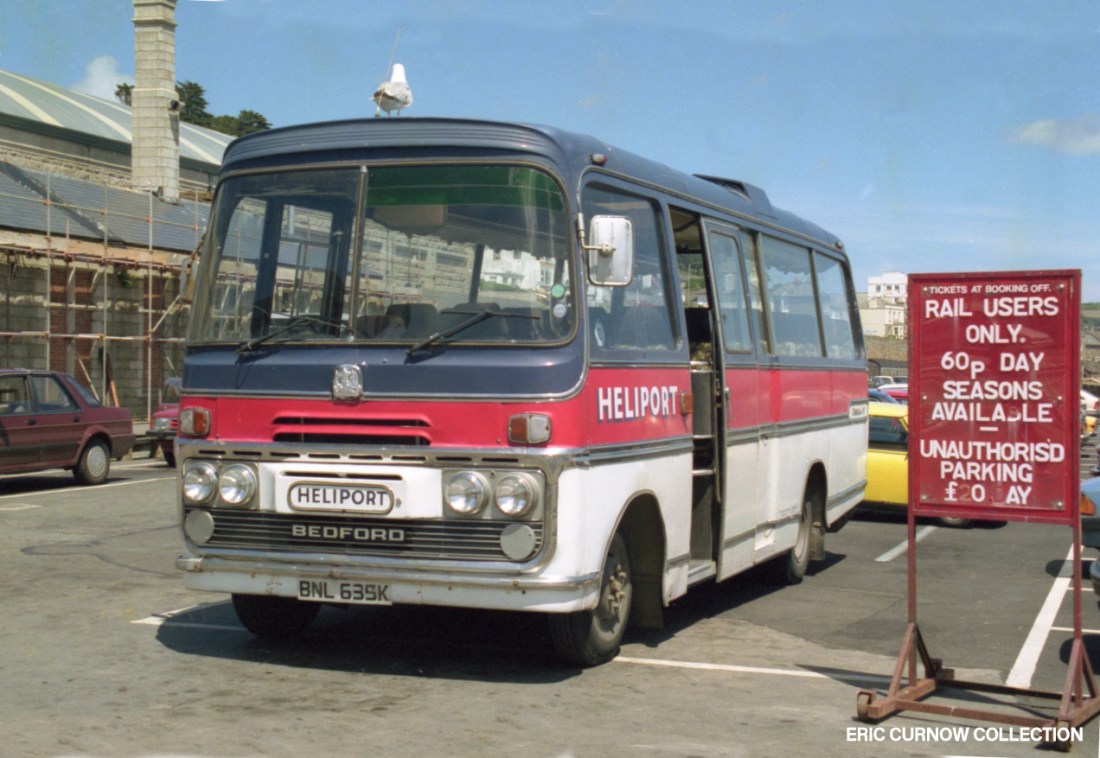 The ubiquitous seagull pads around the top of the Heliport bus in Penzance Station yard as it awaits pessengers arriving on the next down service. I remember such a vehicle in blue and cream livery, but this was taken after I’d been in London for several years, at the time when the station building was being enlarged. 8####ZZ01-PNZ-M_BUS-PARKD