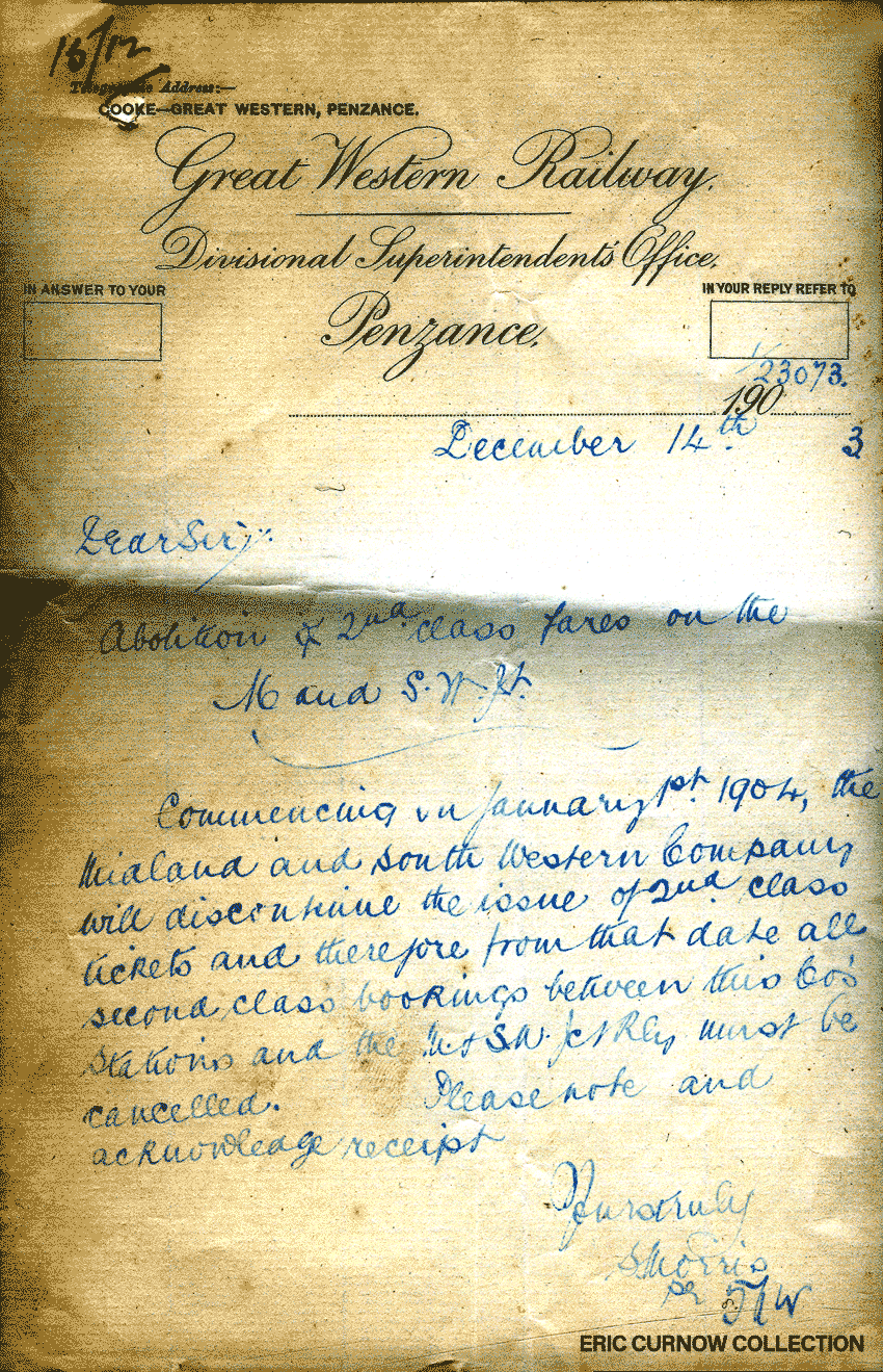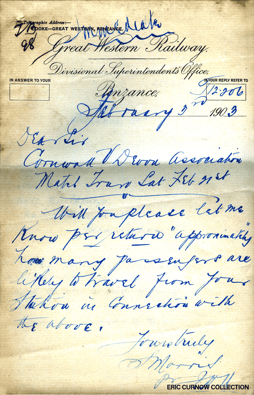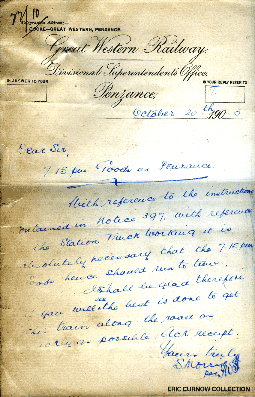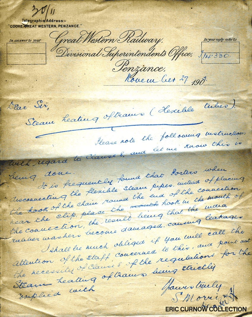 The following are copies of letters from staff at Penzance Station at the turn of last Century. As they were very faded they have been enhanced to make the text legible.
