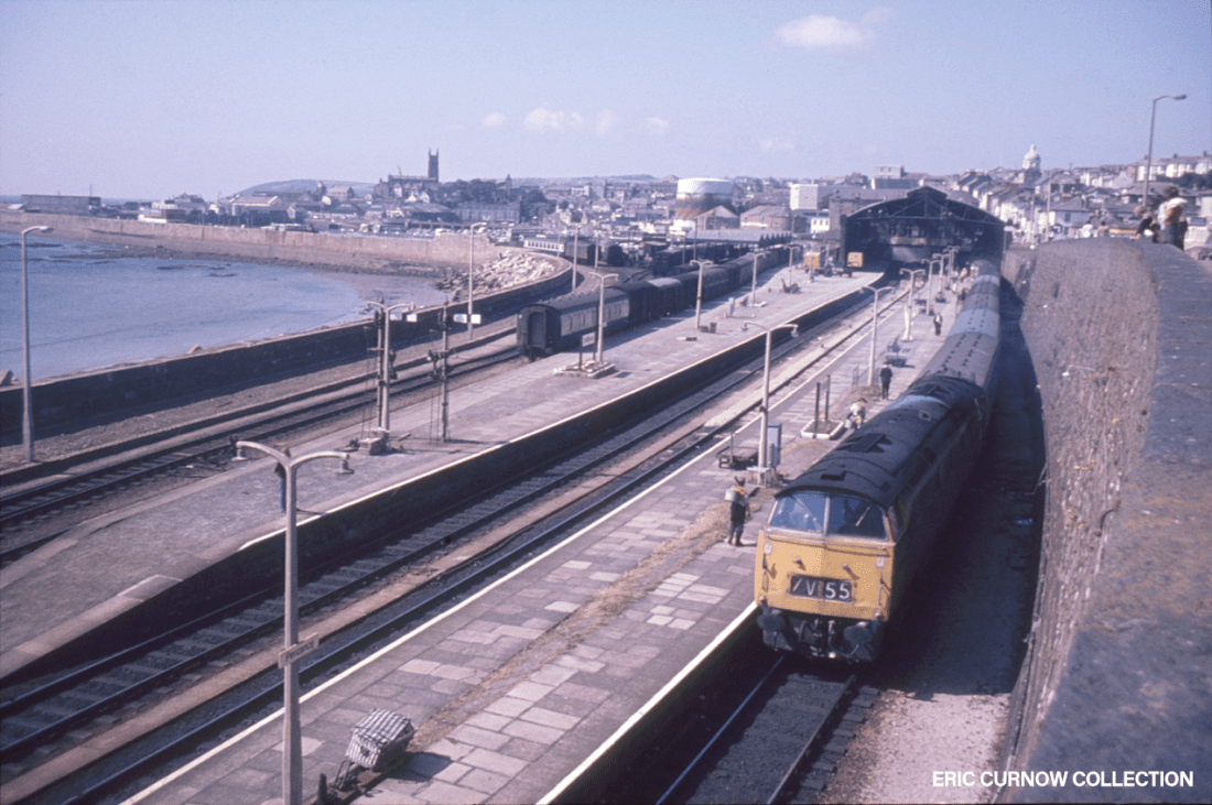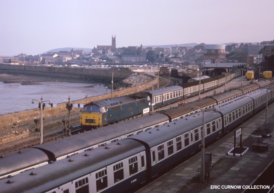 ‘1B45’ draws slowly away from Platform 3 as D1070 “WESTERN GAUNTLET” slackens to line speed to run across the pointwork at the end of Penzance Station. Swash and backwash have coloured the sea white, and even the boardwalk seems to have suffered the spray from the sea’s reach. Photo: Malcolm Arnold 760129A04-PNZ-D1070-PAS_U