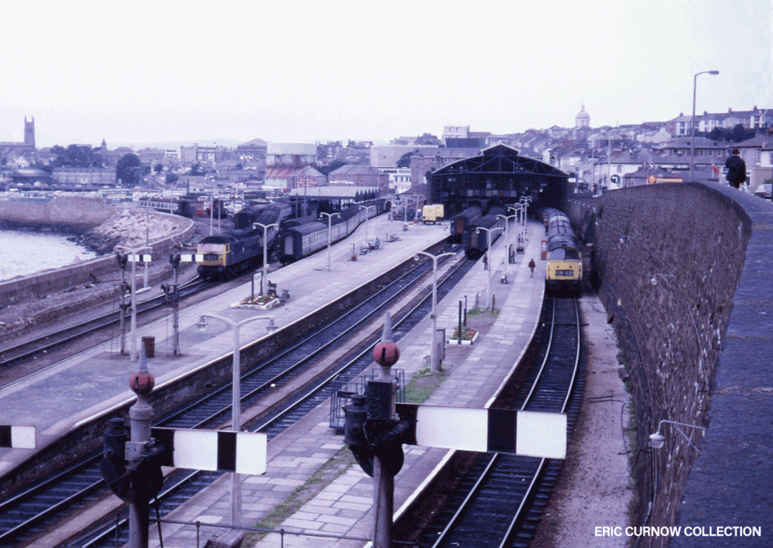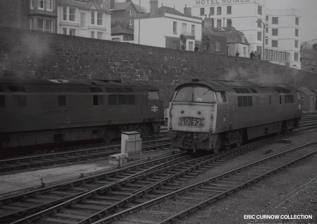 Both locos smoking badly, this 70s view of Penzance Station shows D1072 “WESTERN GLORY” heading an up passenger train at the end of platform 2, as D1048 “WESTERN LADY” runs in light engine to head a similar service. To the right is the pilot’s siding and the two courses of brick of the old crane’s road, and to the left on top of the sea wall onlookers watch. 7#####999-PNZ-D10XX-MISCS