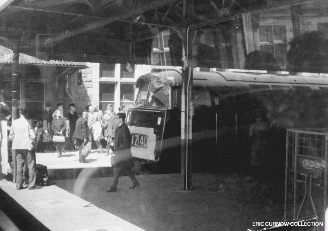 D1038 “WESTERN AMBASSADOR”, lately arrived with a van train, attracts the attention of a guard at the barriers of Platforms 1 and 2 of Penzance Station. The John Menzies bookstall, as I think it was then, is bottom right, and the seating solely on Platform 3 reinforces its ‘Arrivals” role, for waiting greeters. 760501A01-PNZ-D1038-PAS_D