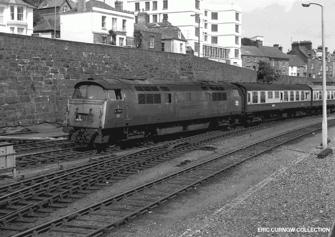 At the end of its run, D1015 “WESTERN CHAMPION” enters Penzance Station – its headcode apparently damaged by a strike of some sort. The first carriage contains a mini-buffet, used where a full provision wasn’t justified. Passengers look expectantly from the windows. Photo: John Vaughan 7####FU01-PNZ-D1015-PAS_D