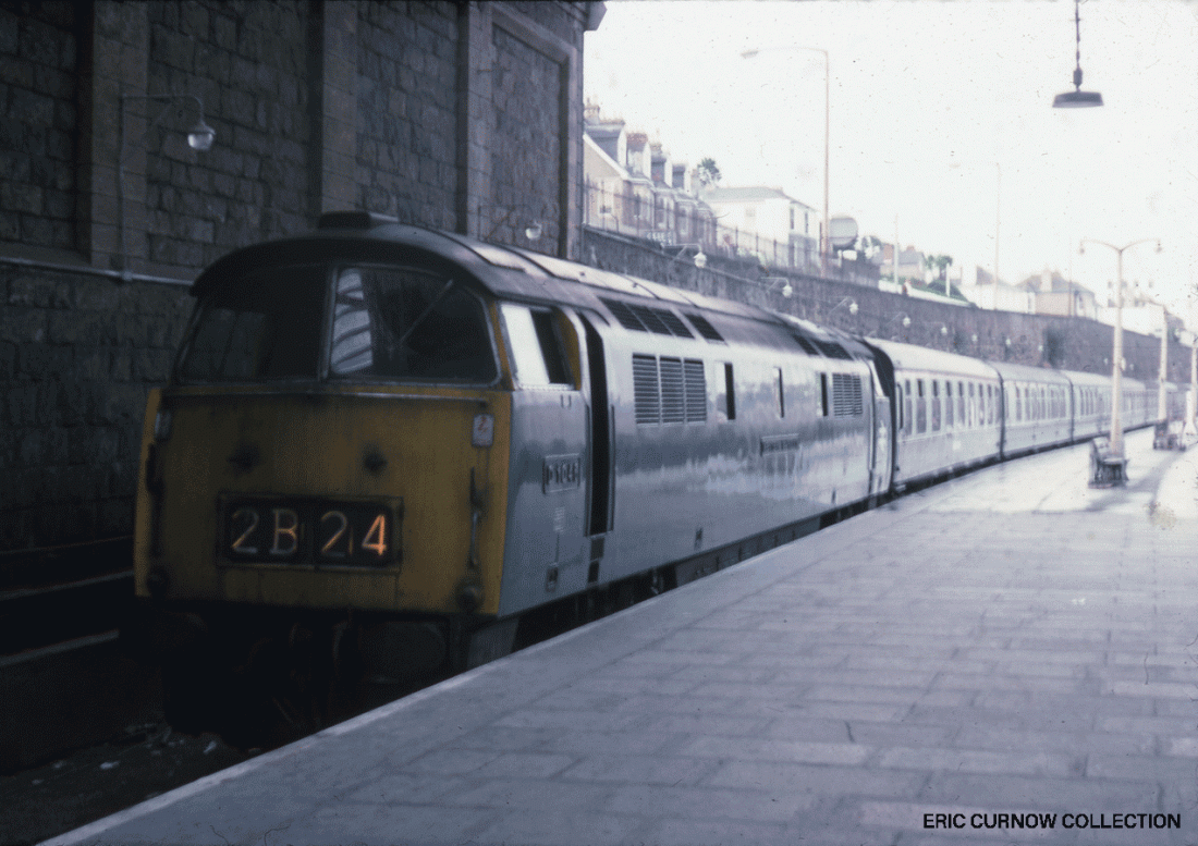 A ‘Western’ heading the “up” Riviera smokes under the oppressive atmosphere of a wet morning in the mid 1970s. Carriages are variously spread around the site, and the massive size of the granite coping stones to the retaining wall can be clearly seen. 6####GO01-PNZ-D10##-PAS_U